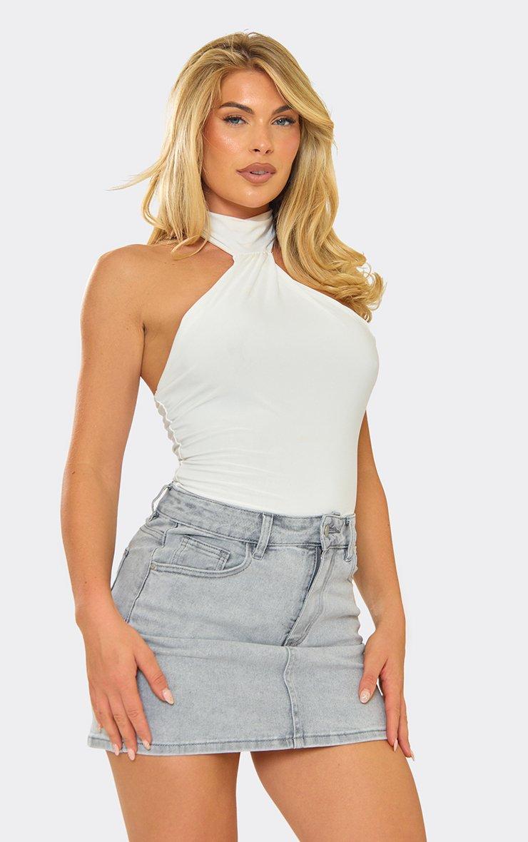 High Waist Wrap Over Detail Mini Skirt In Charcoal Grey Acid Wash Denim