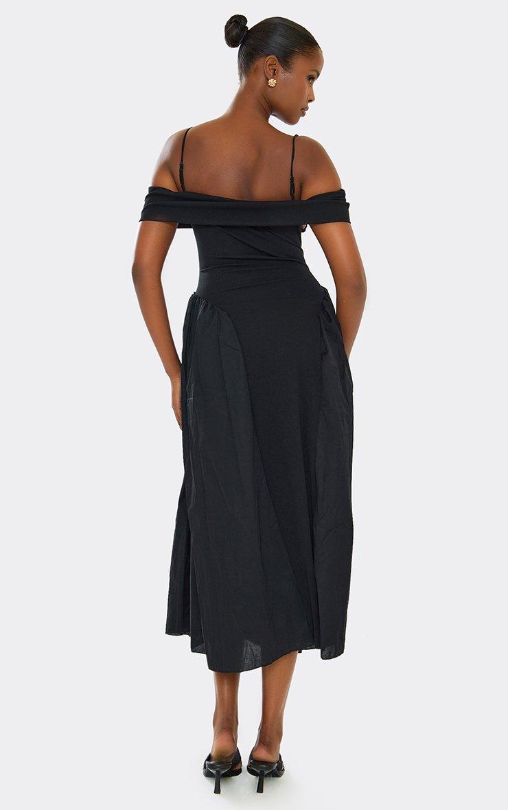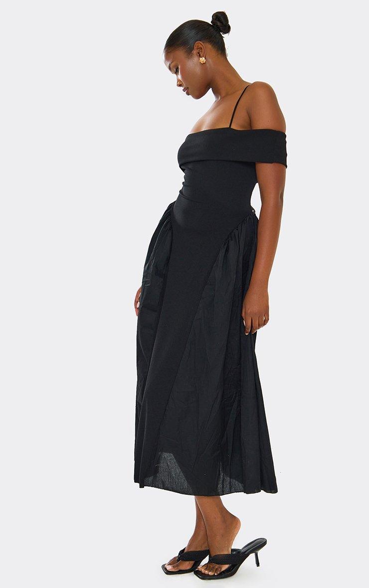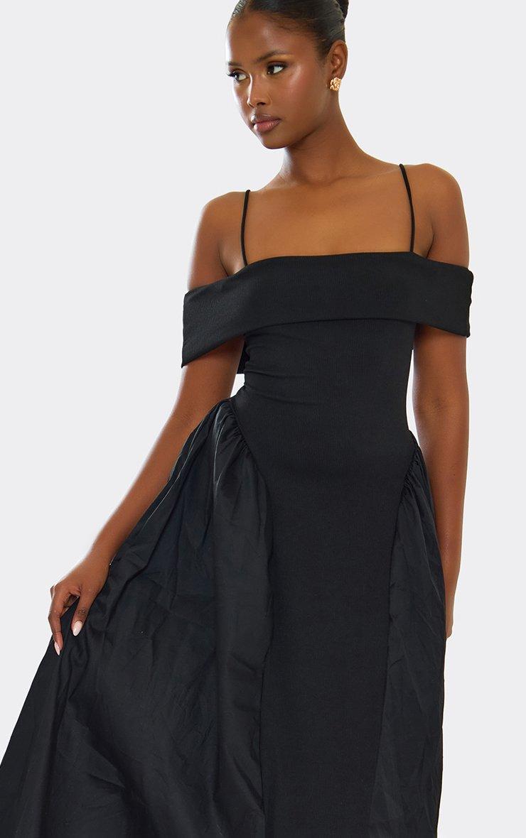 Bardot Strap Detail Rib Panel Skater Midi Dress In Black