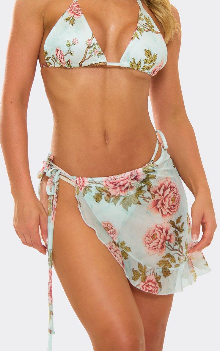 Tie Side Frilled Mini Sarong In Blue Floral Print Mesh