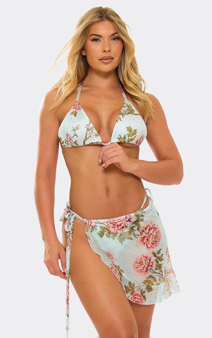 tie side frilled mini sarong in blue floral print mesh