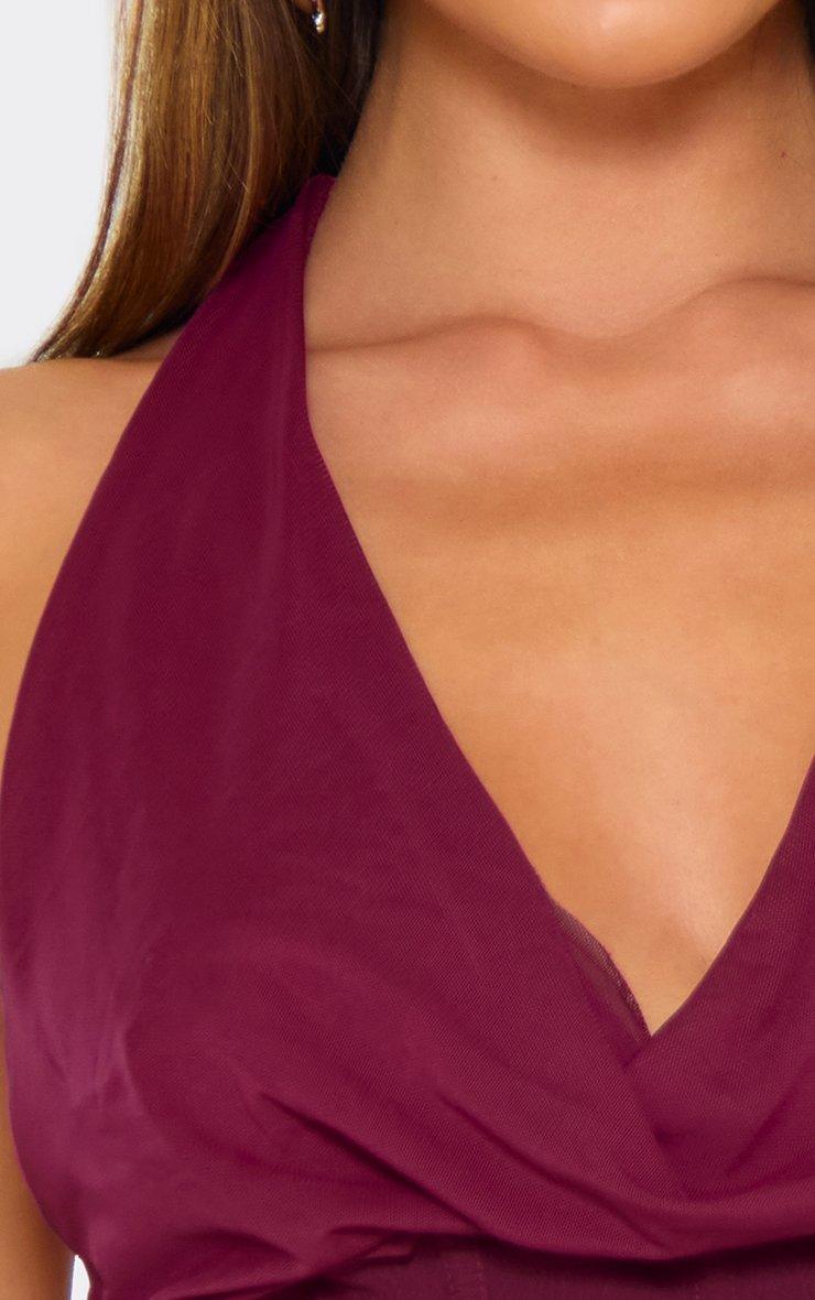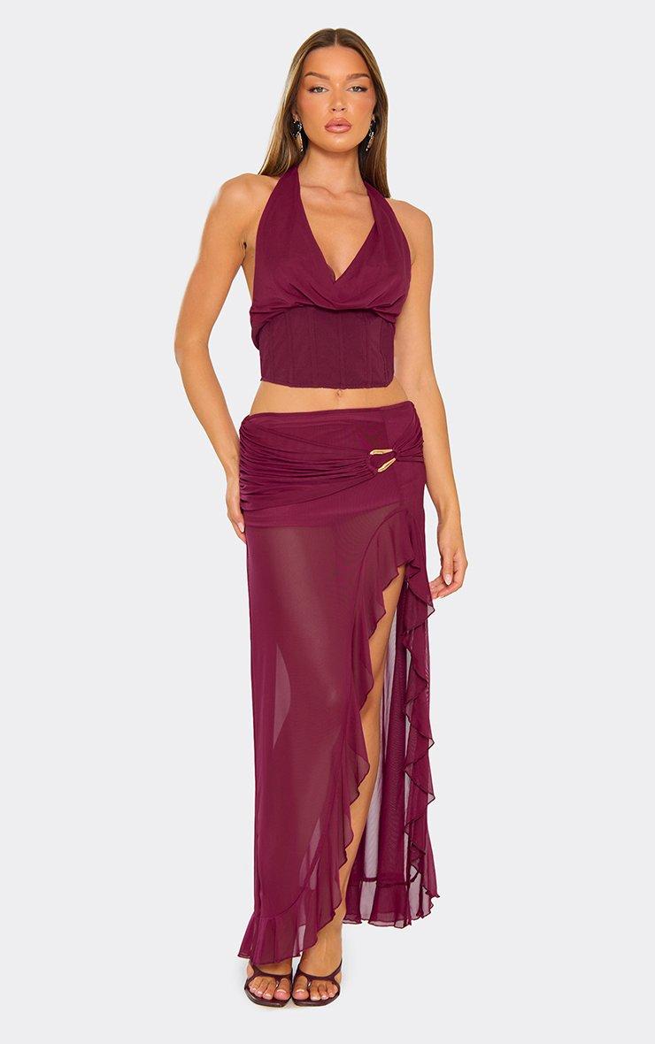 Halterneck Tie Back Ruched Fringe Detail Crop Top In Plum