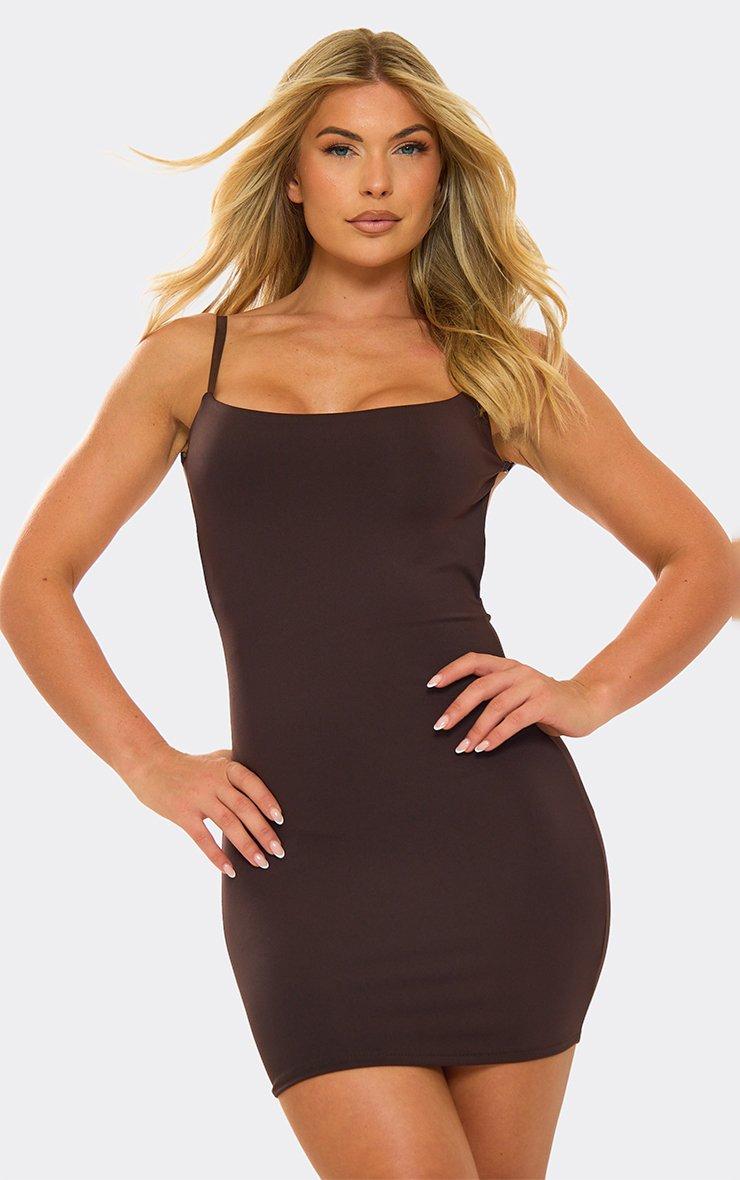 Square Neck Scoop Back Ruched Bum Detail Mini Dress In Brown Slinky