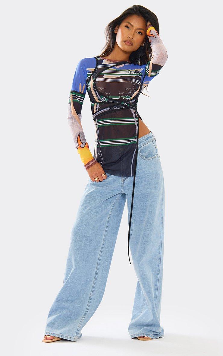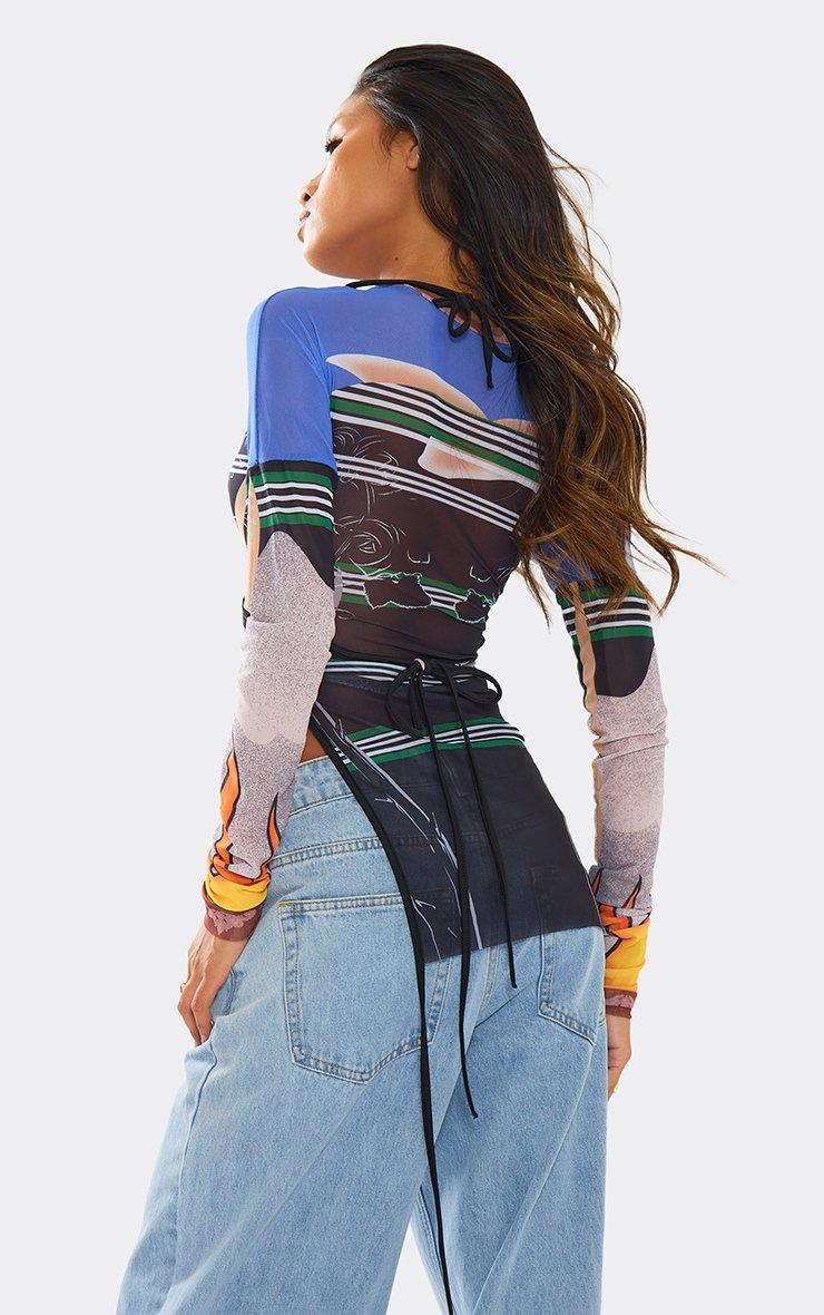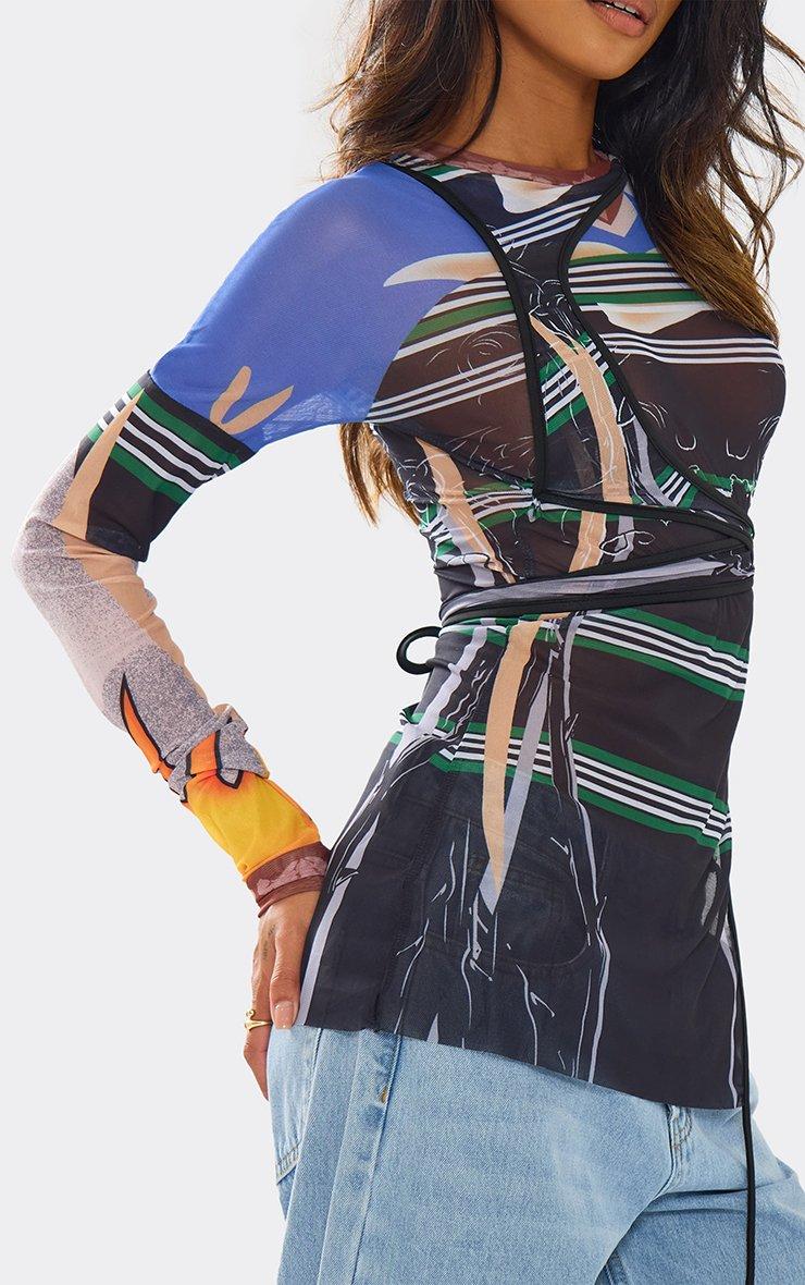 Long Sleeve Side Split Detail Top In Multi Abstract Print Mesh