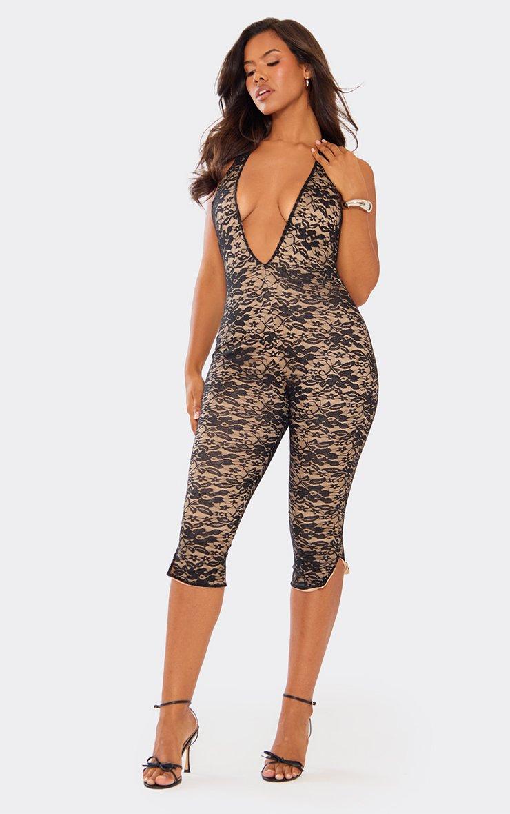 High Neck Trim Bardot Detail Capri Jumpsuit In Black Slinky