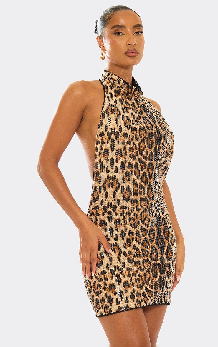 high cowl neck open back detail mini dress in brown leopard print sequin