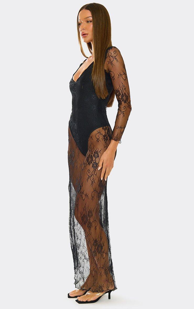 Bandeau Bodysuit Detail Maxi Dress In Black Sheer Lace