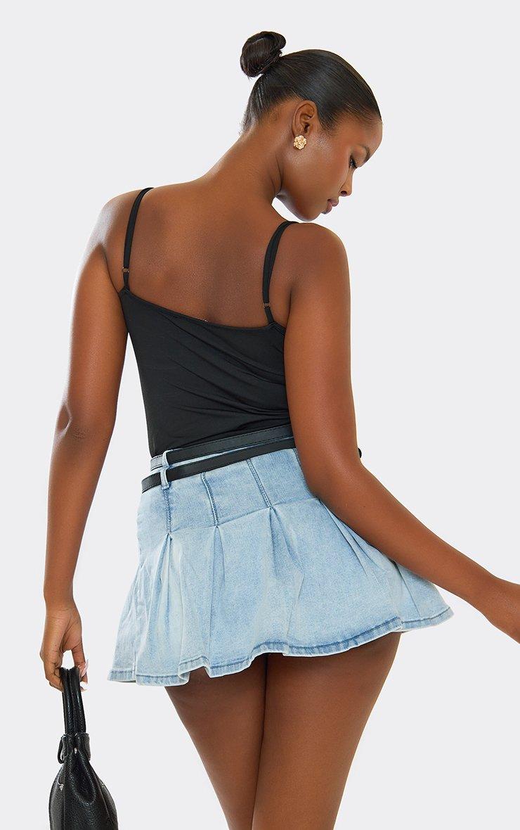 Mid Rise Black Double Belt Detail Mini Skirt In Light Blue Wash Denim