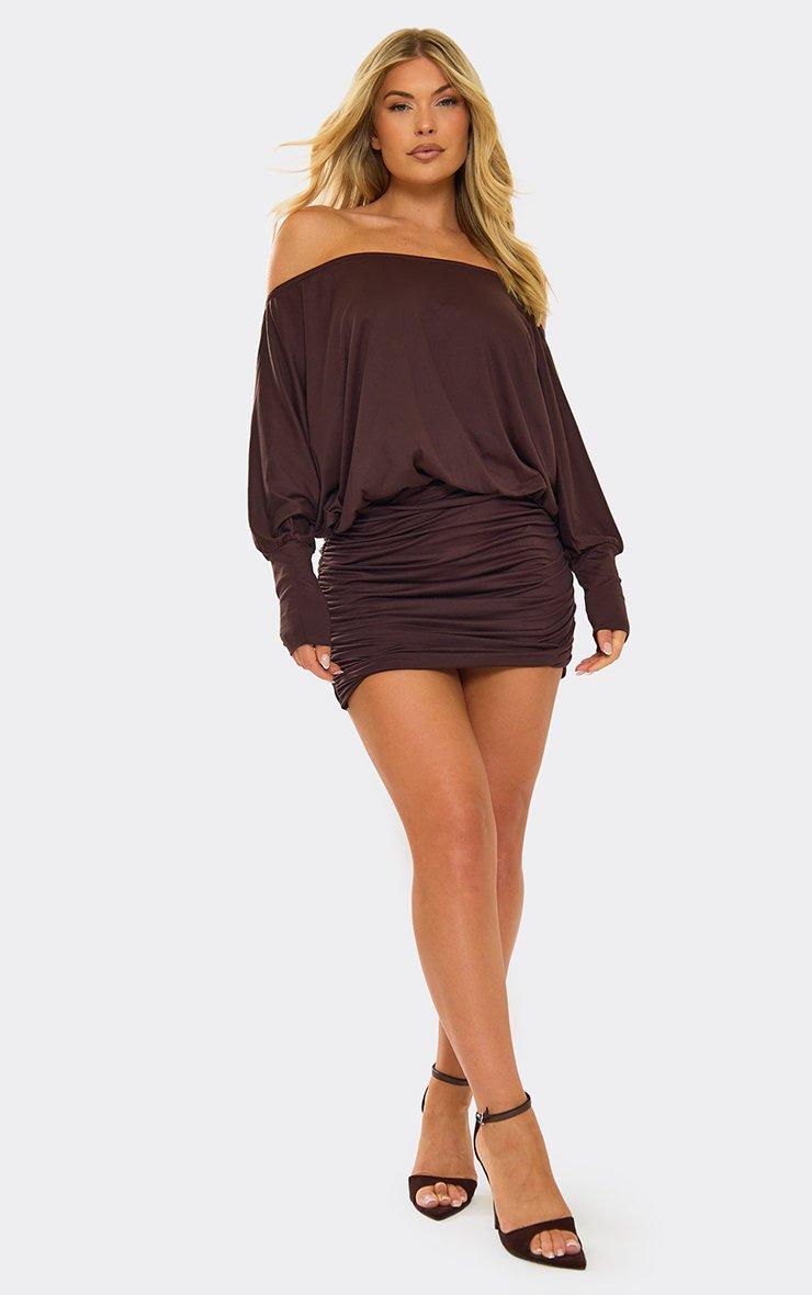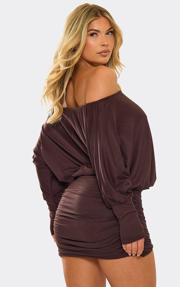 Off The Shoulder Draped Asymmetric Mini Dress In Chocolate Brown