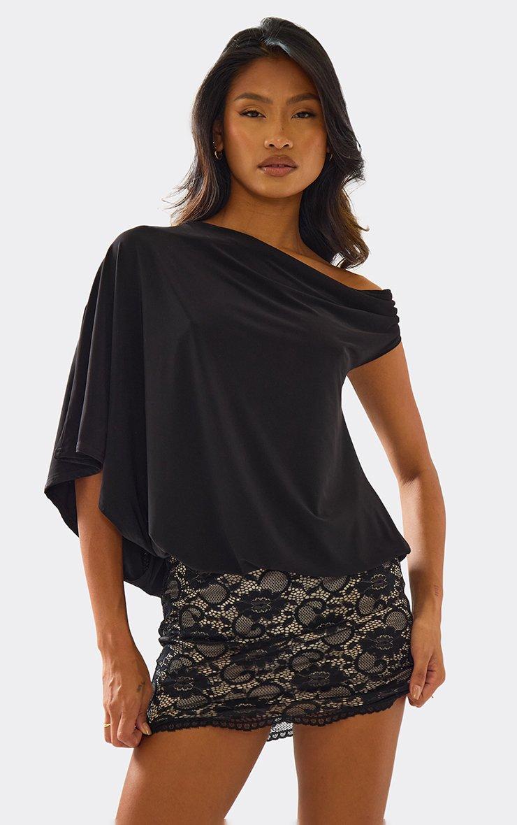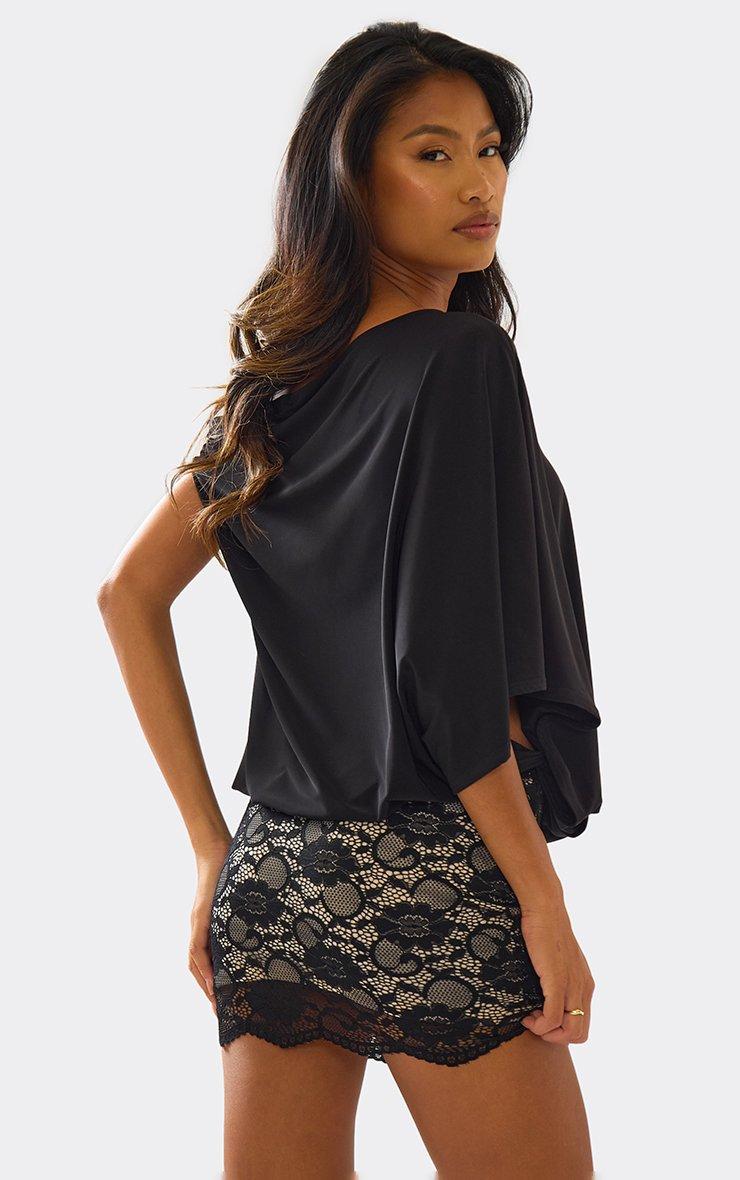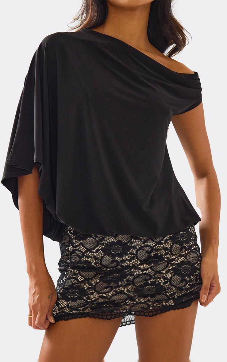 Asymmetric Shoulder Contrast Lace Skirt Detail Mini Dress In Black