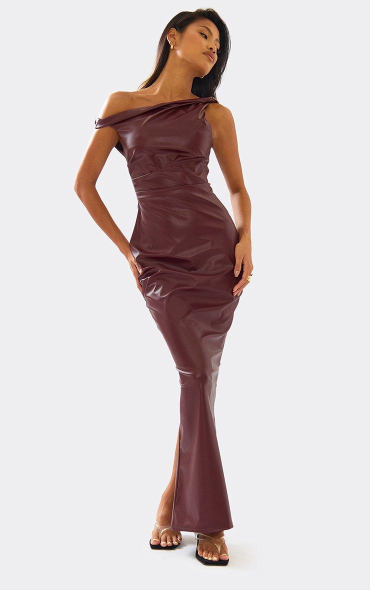 asymmetric shoulder fitted maxi dress in burgundy faux leather