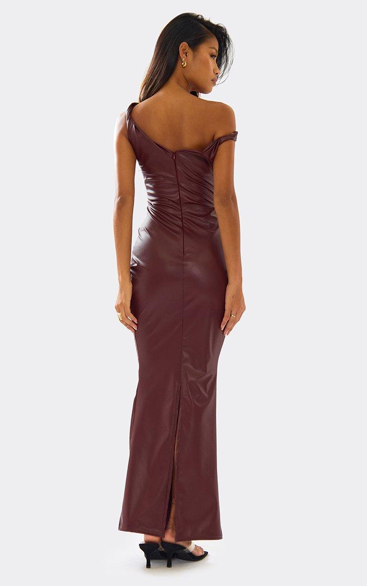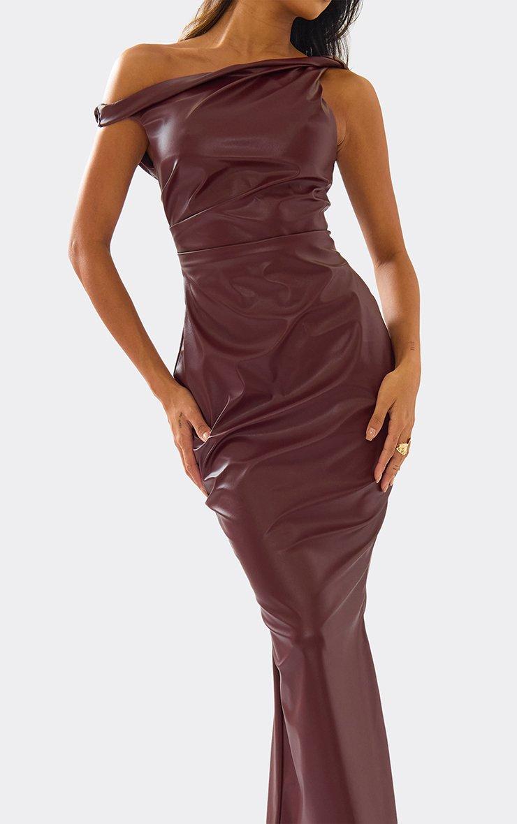 Asymmetric Shoulder Fitted Maxi Dress In Burgundy Faux Leather