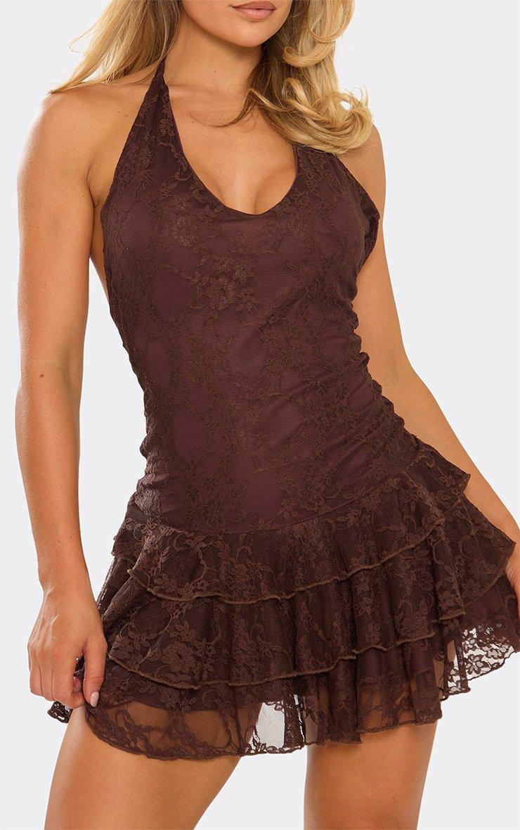 45908 Halterneck Ruffle Detail Lace Mini Dress In Brown