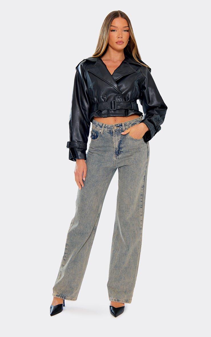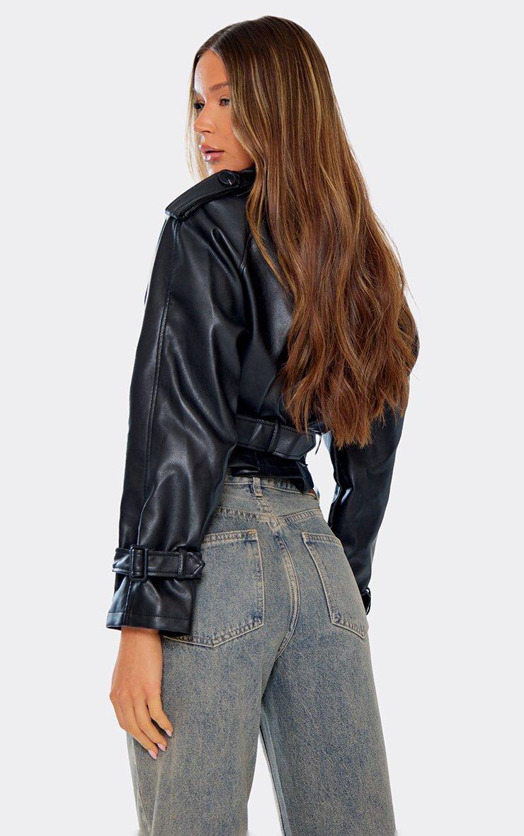 Long Sleeve Button Front Belted Cropped Trench Jacket In Black Faux Leather