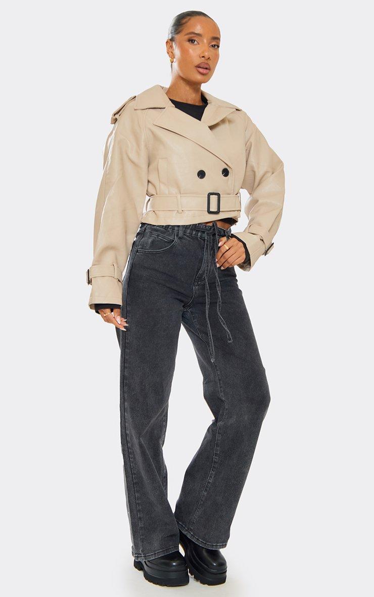 long sleeve button front belted cropped trench jacket in stone faux leather