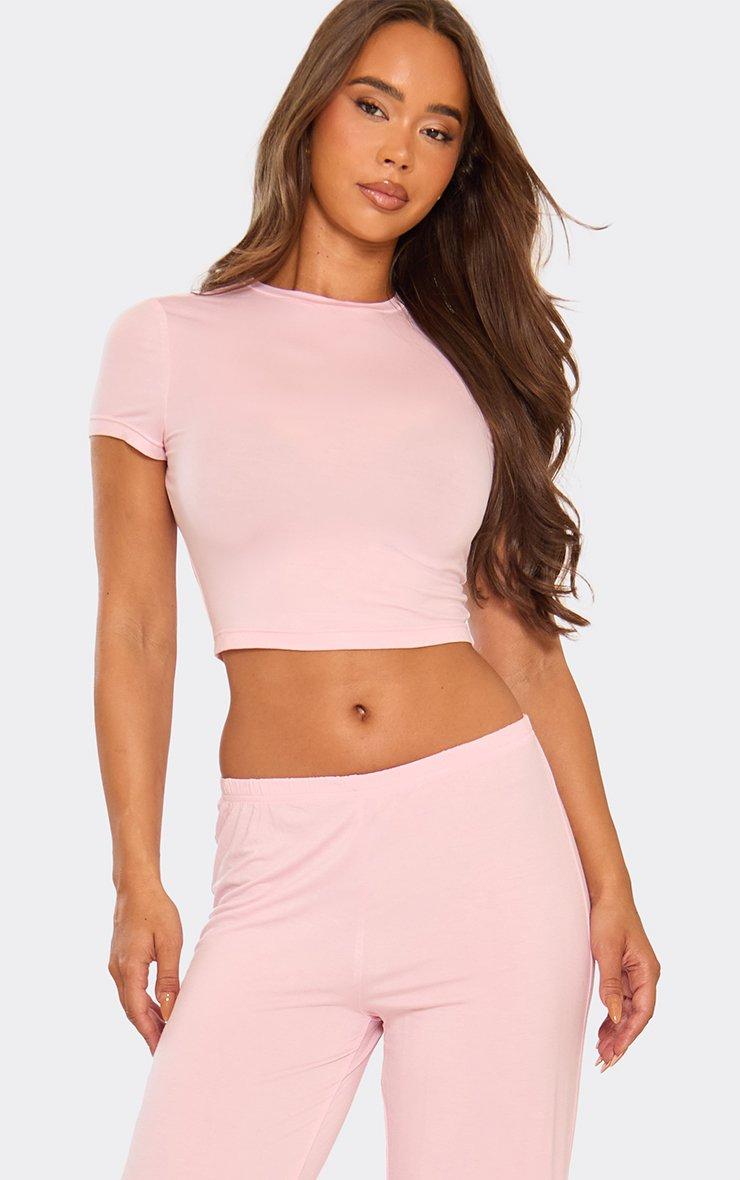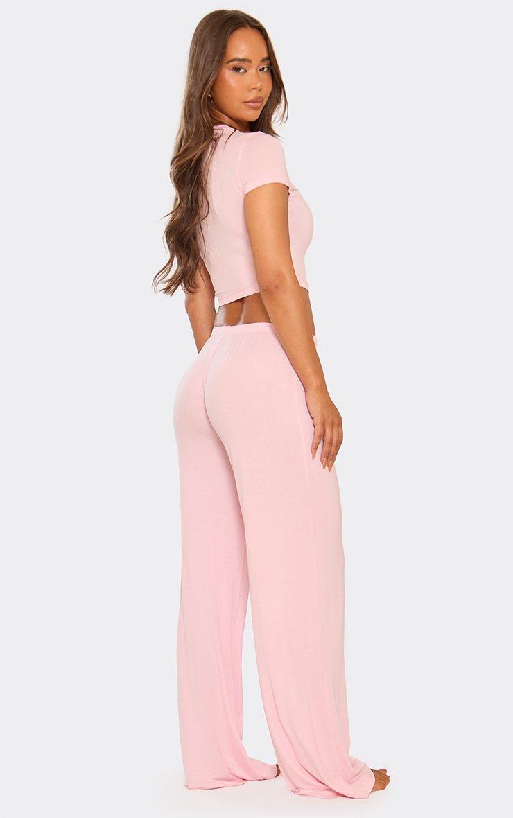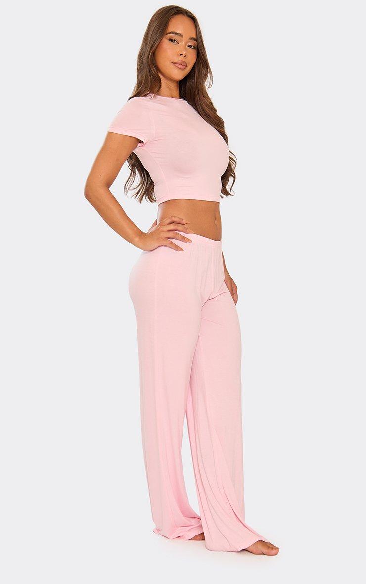Short Sleeve Crop Top And Wide Leg Trouser Set In Baby Pink