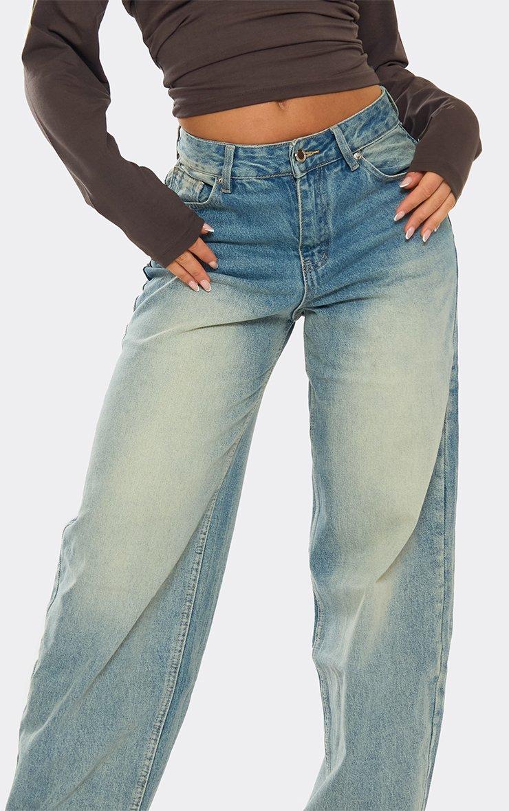 Mid Rise Distressed Detail Wide Leg Jeans In Washed Mid Blue Denim