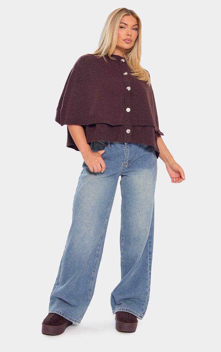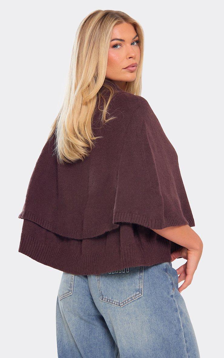 High Neck Batwing Frayed Hem Detail Top In Chocolate Brown Compact Knit