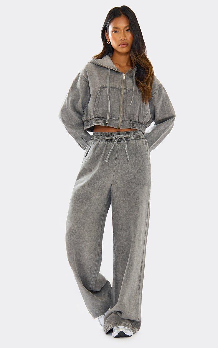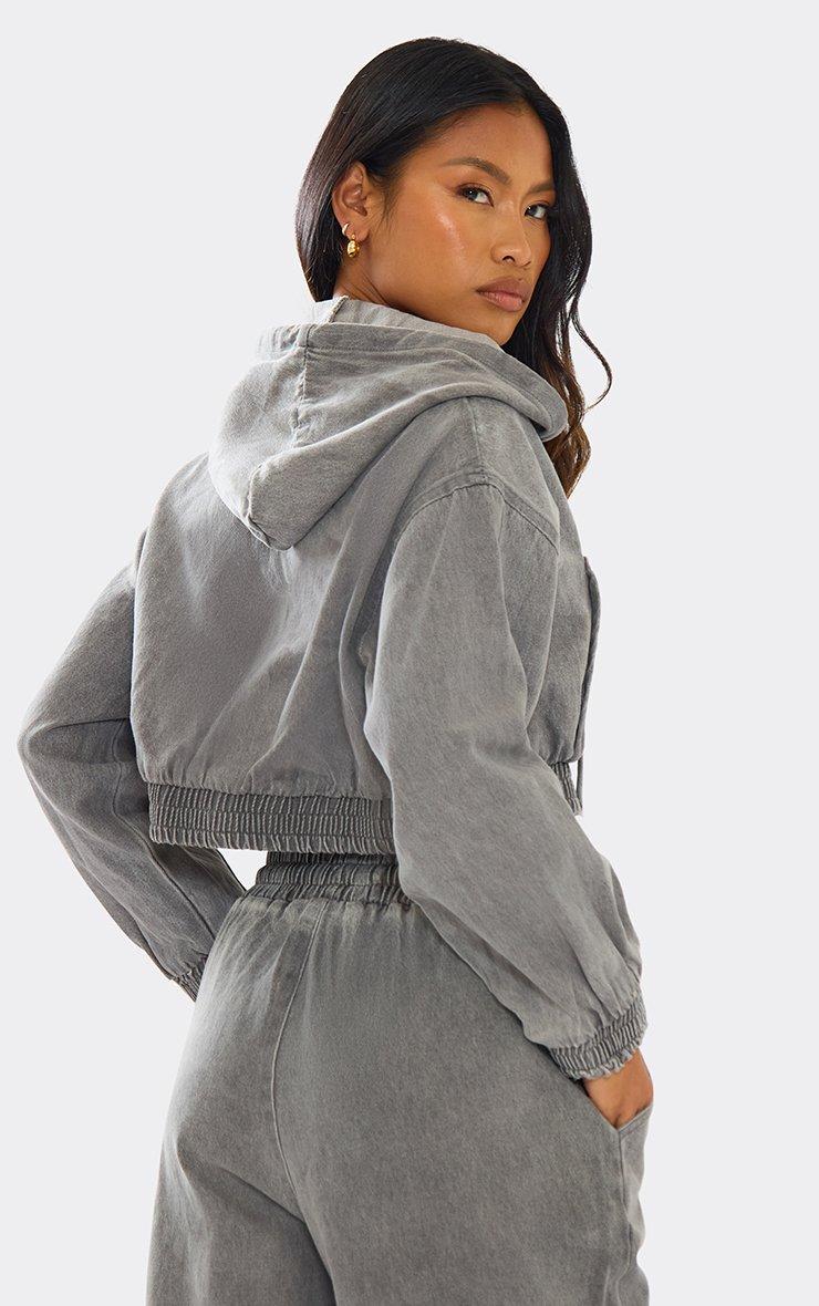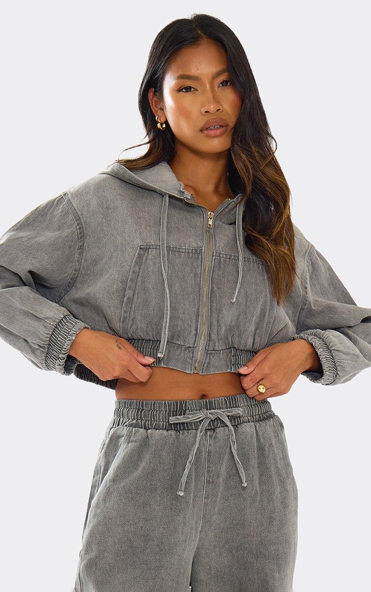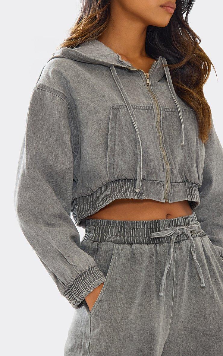 Long Sleeve Zip Up Front Detail Hoodie In Washed Grey Denim