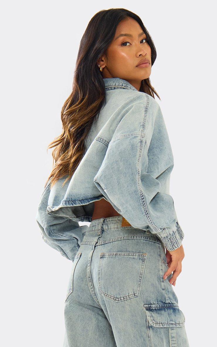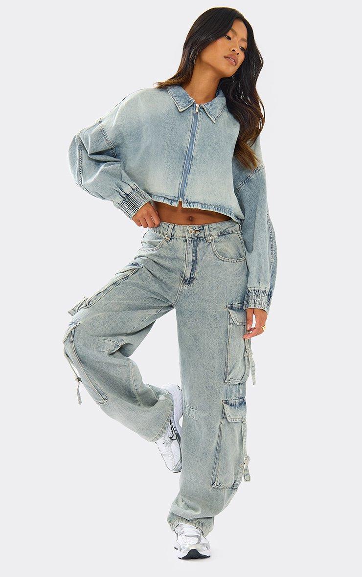 Long Sleeve Zip Up Boxy Jacket In Washed Blue Denim