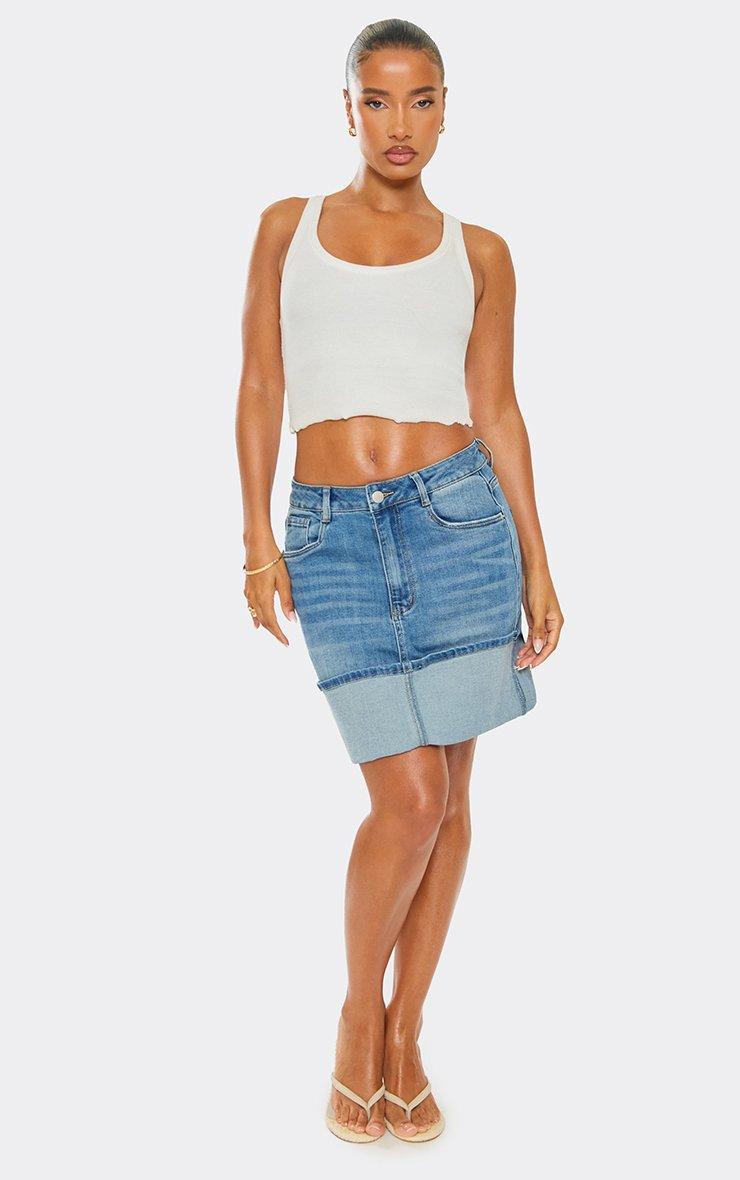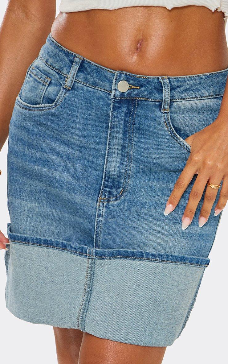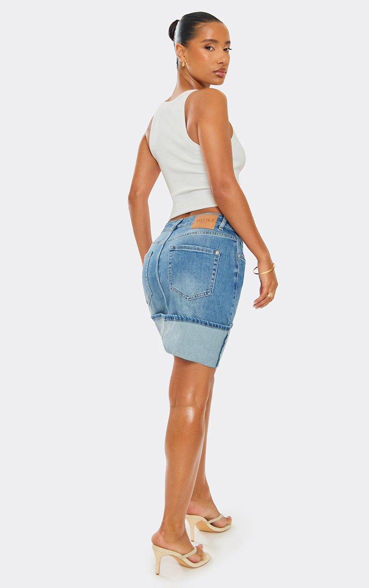 Mid Rise Turn Up Hem Detail Mini Skirt In Washed Blue Denim