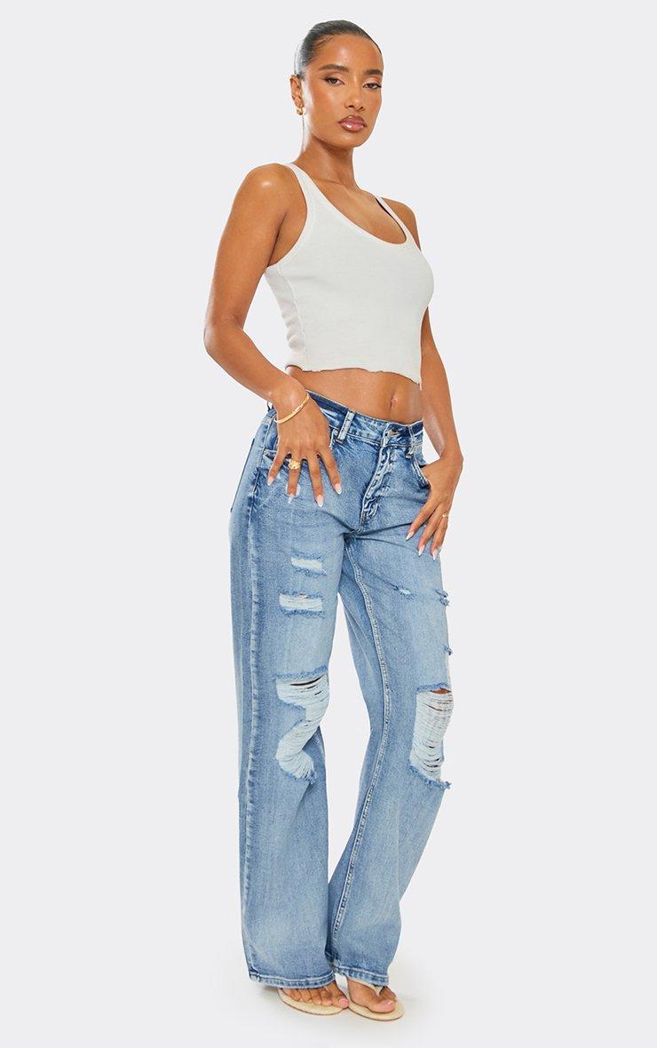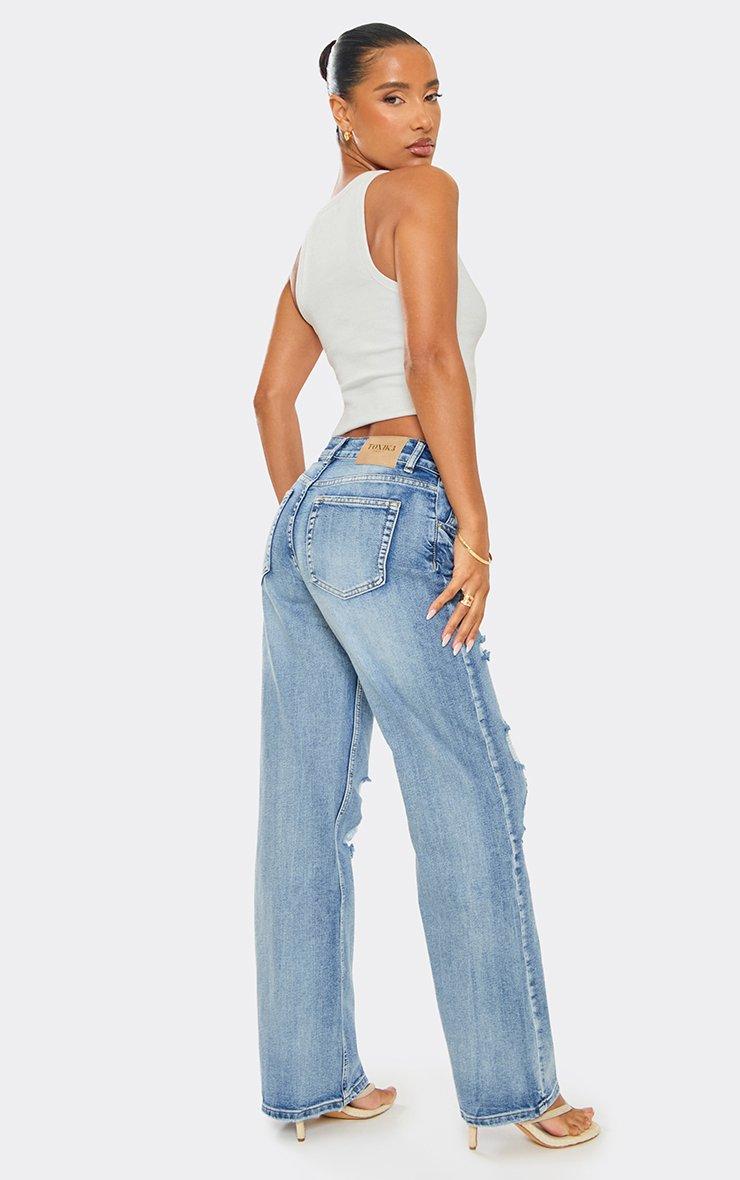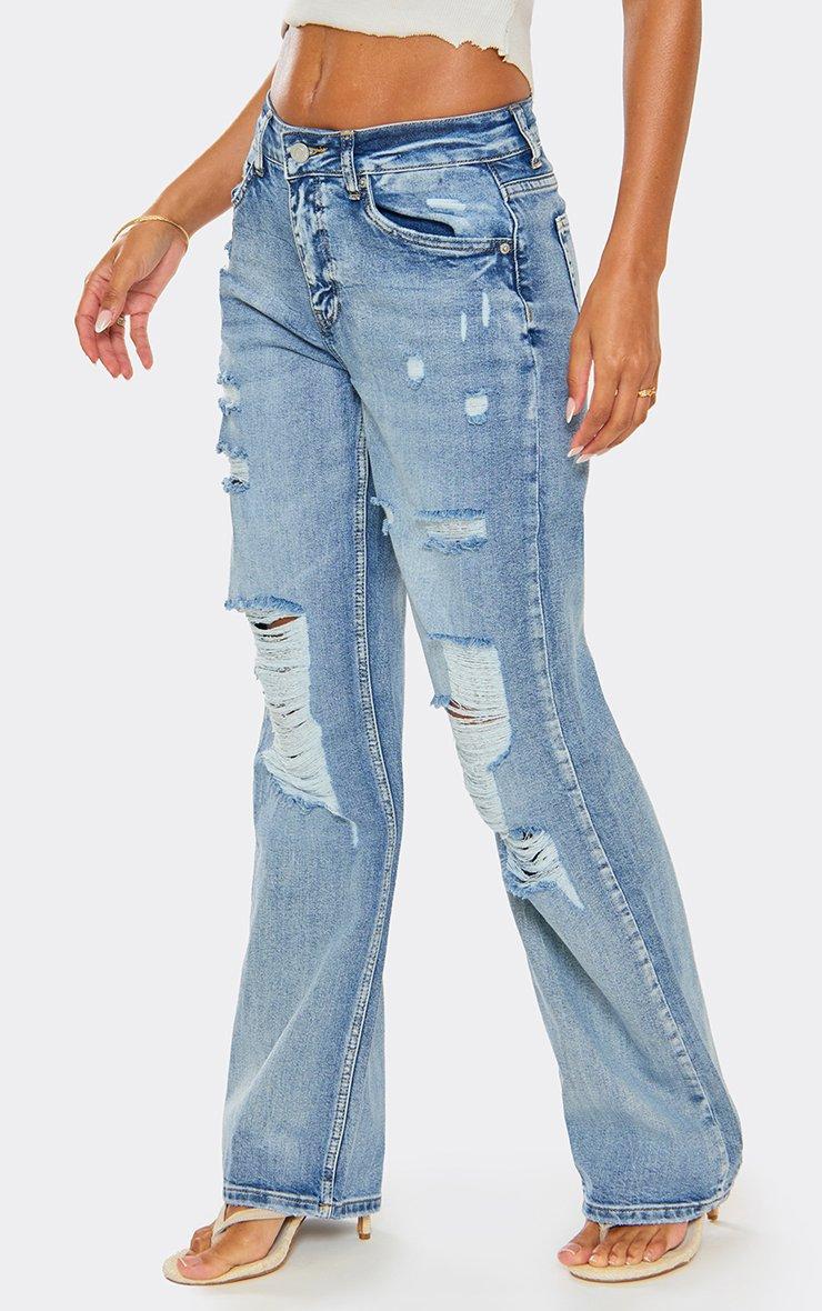 Mid Rise Distressed Ripped Detail Jeans In Washed Blue Denim