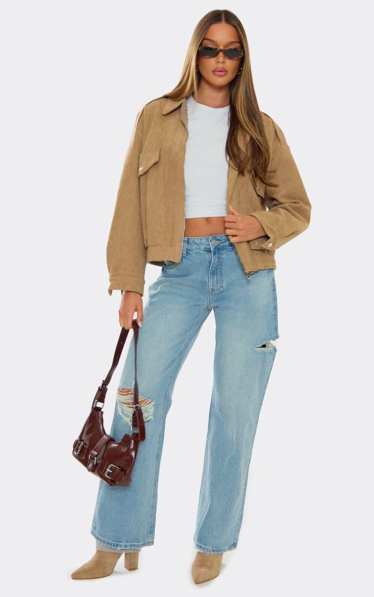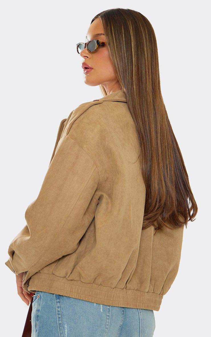 Long Sleeve Pocket Detail Bomber Jacket In Brown Faux Suede
