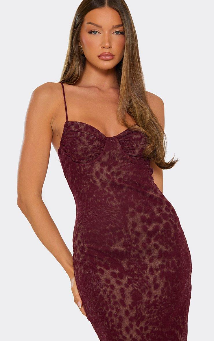 Strappy Ruched Bust Detail Midi Dress In Burgundy Leopard Print Mesh