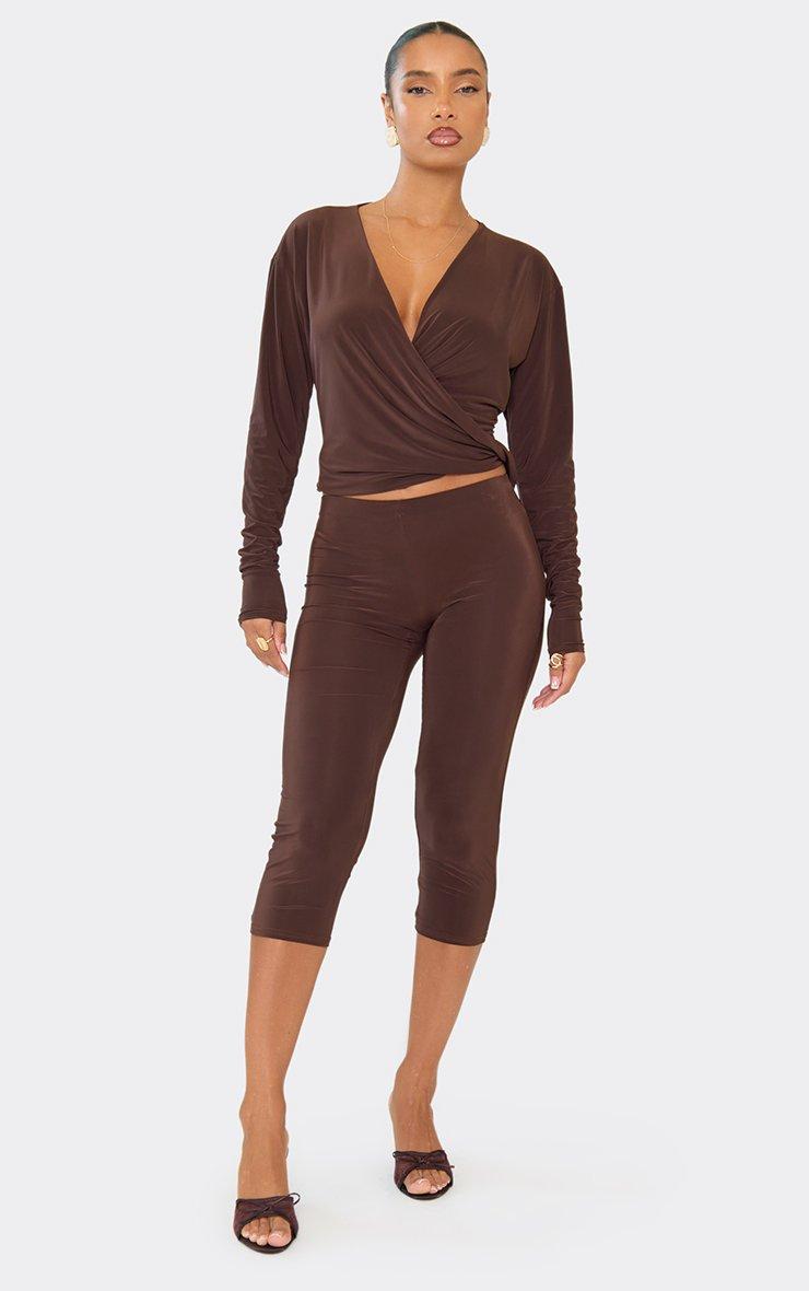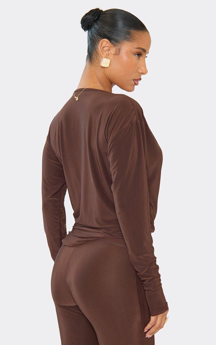 Long Sleeve Cross Over Cowl Neck Top In Chocolate Brown