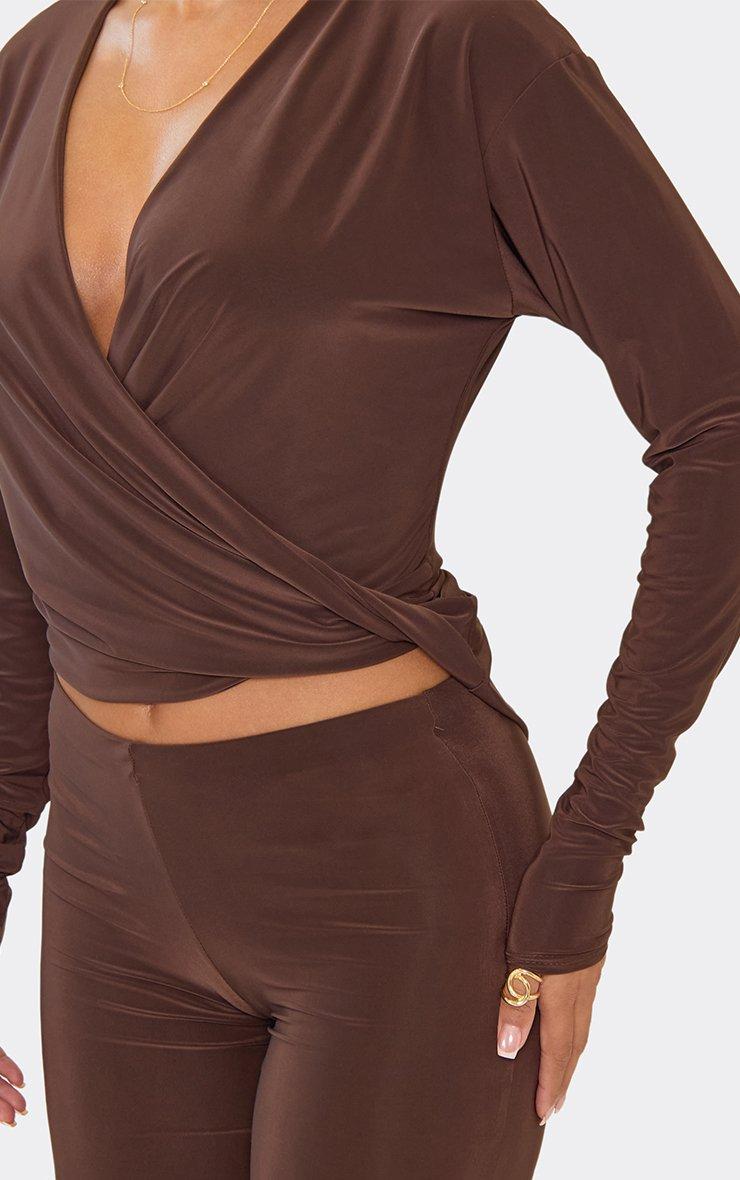 long sleeve cross over cowl neck top in chocolate brown