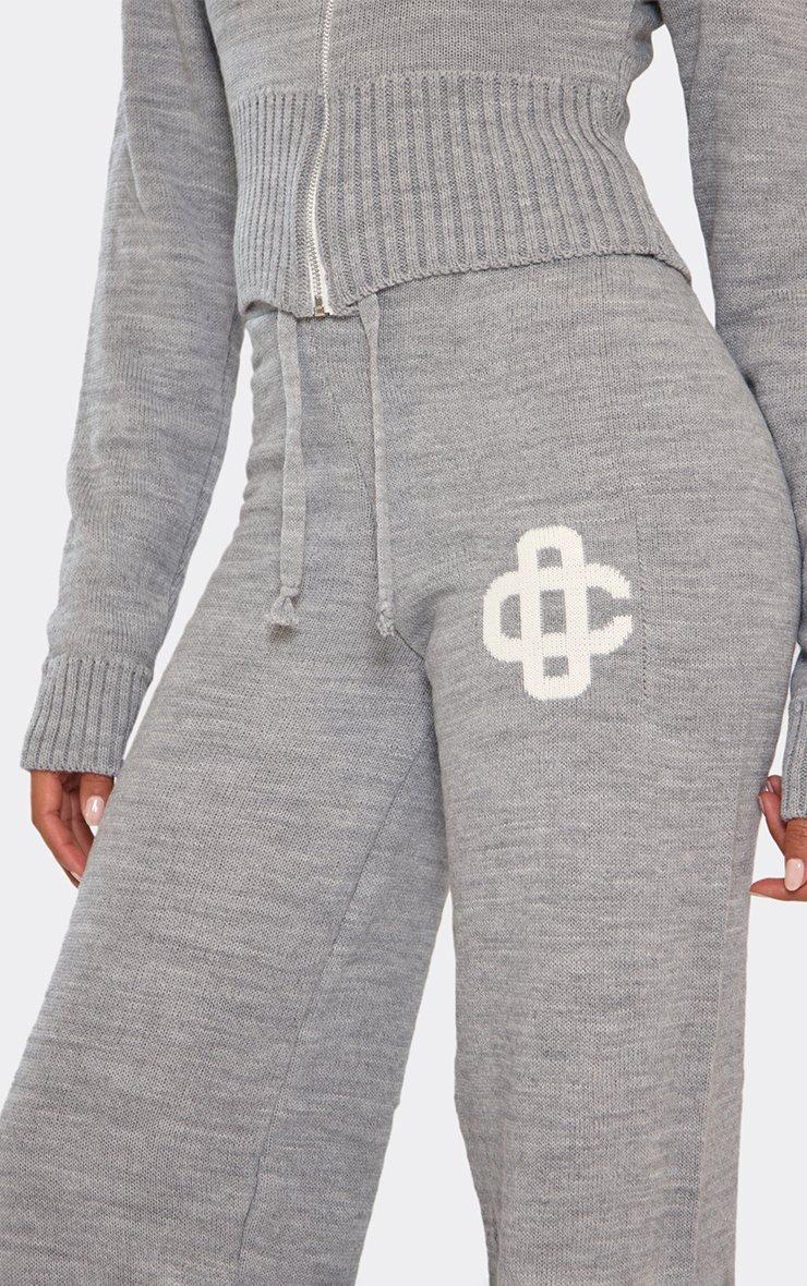 High Waist Embroidered Ego Logo Wide Leg Trousers In Grey Knit
