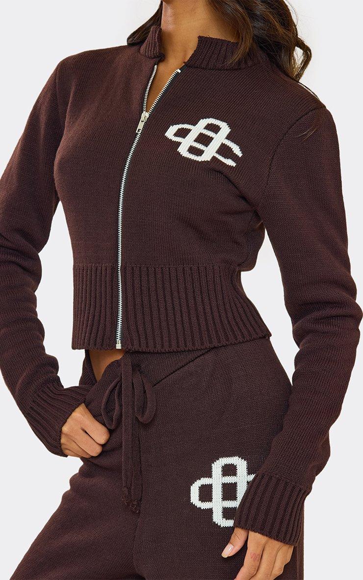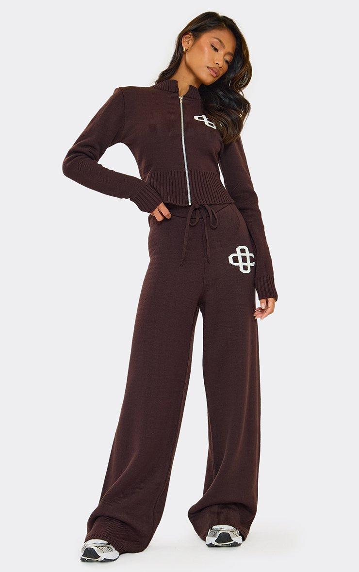 High Waist Embroidered Ego Logo Wide Leg Trousers In Chocolate Brown Knit