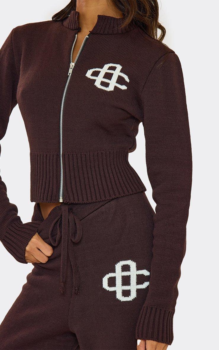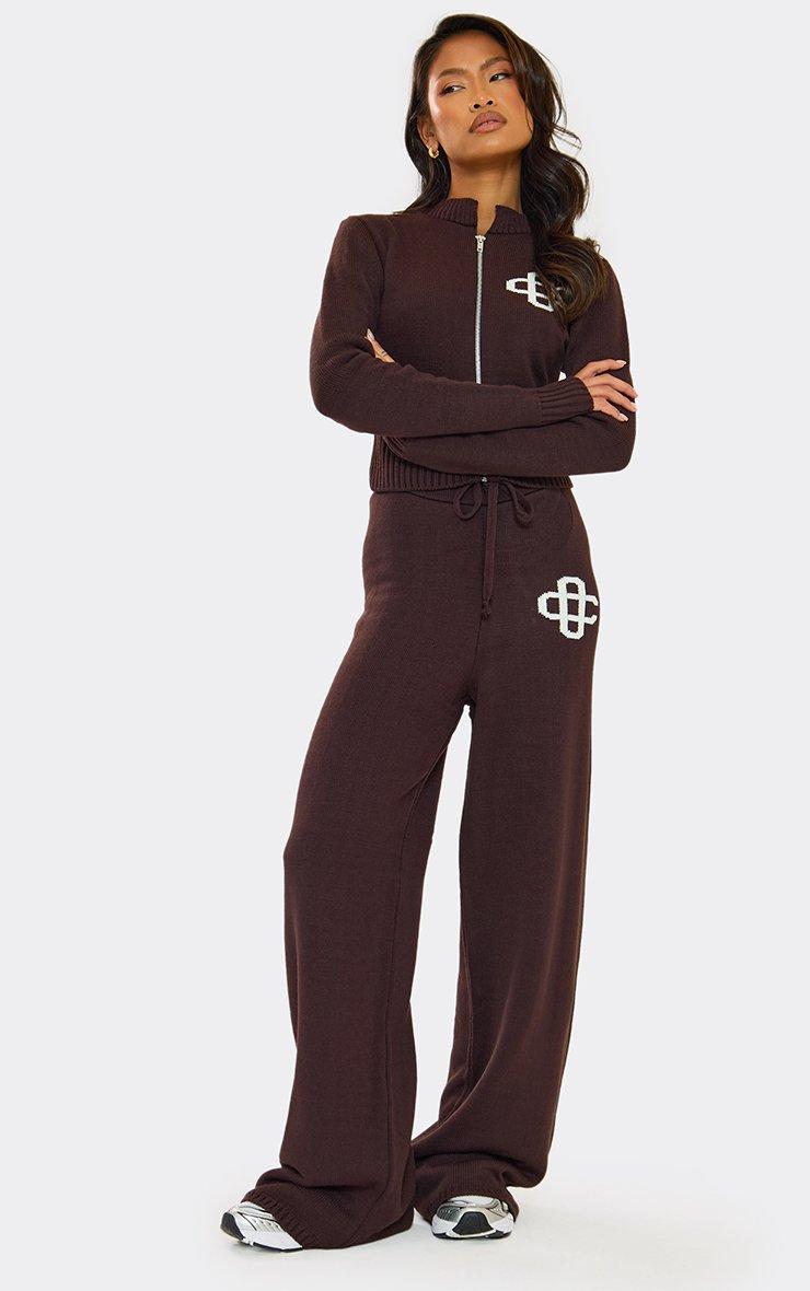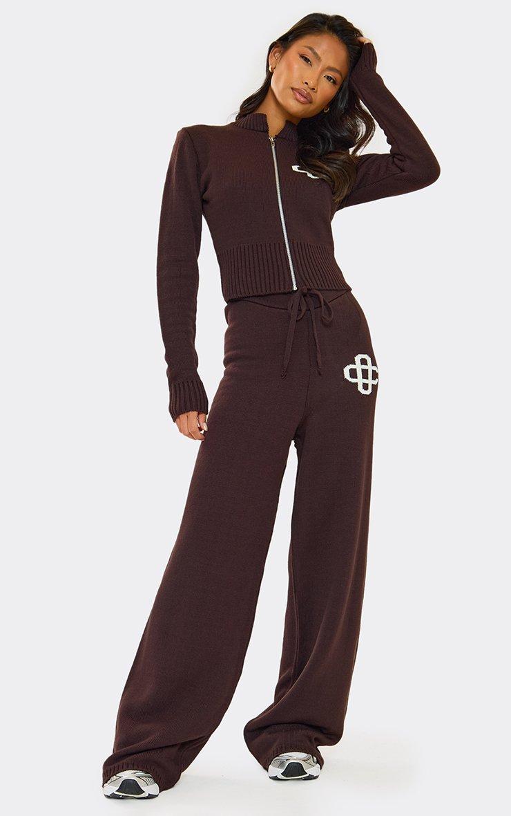 Tie Waist Swirl Detail Wide Leg Trousers In Chocolate Brown Knit
