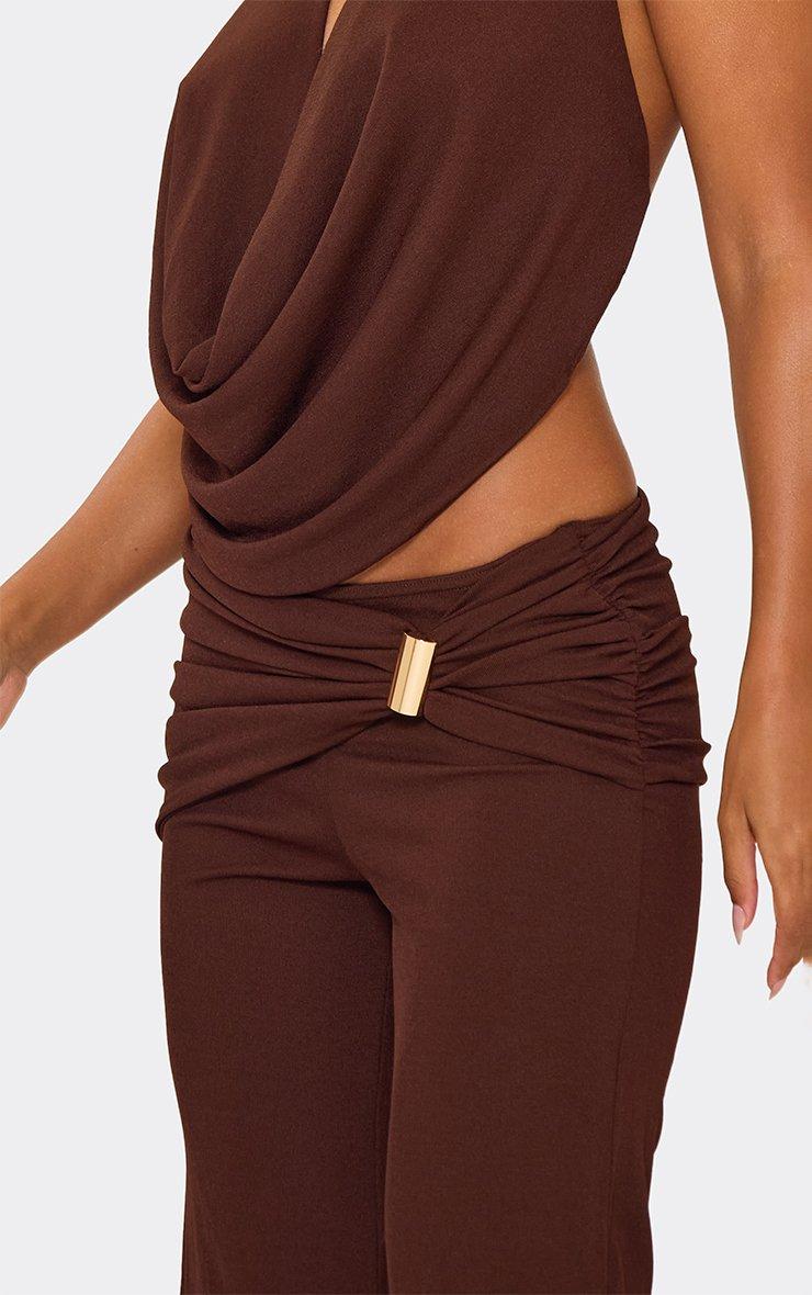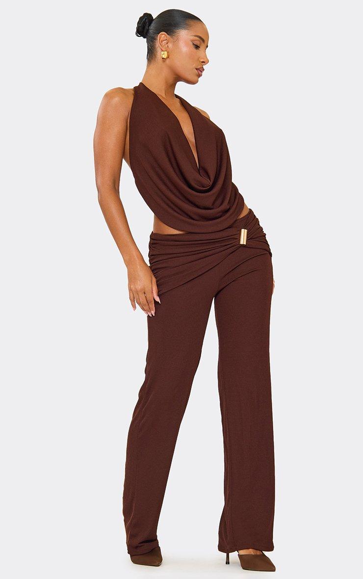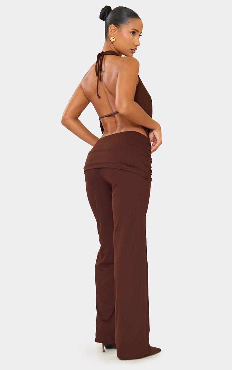 Fold Over Ruched Skinny Flared Leg Trousers In Chocolate Brown
