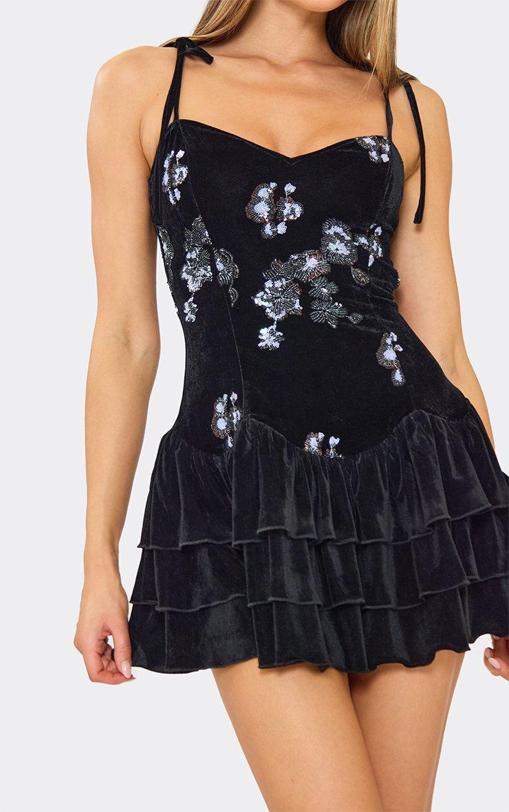 Tie Shoulder Floral Sequin Layered Hem Detail Mini Dress In Black Velvet
