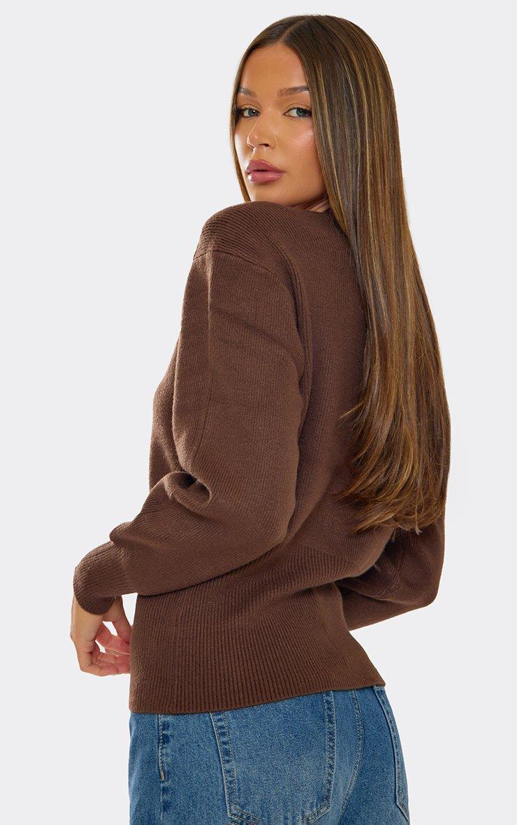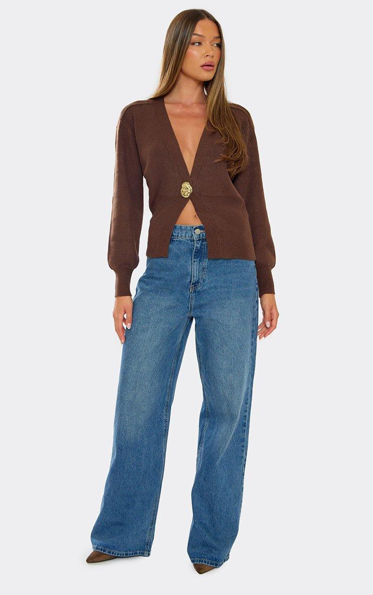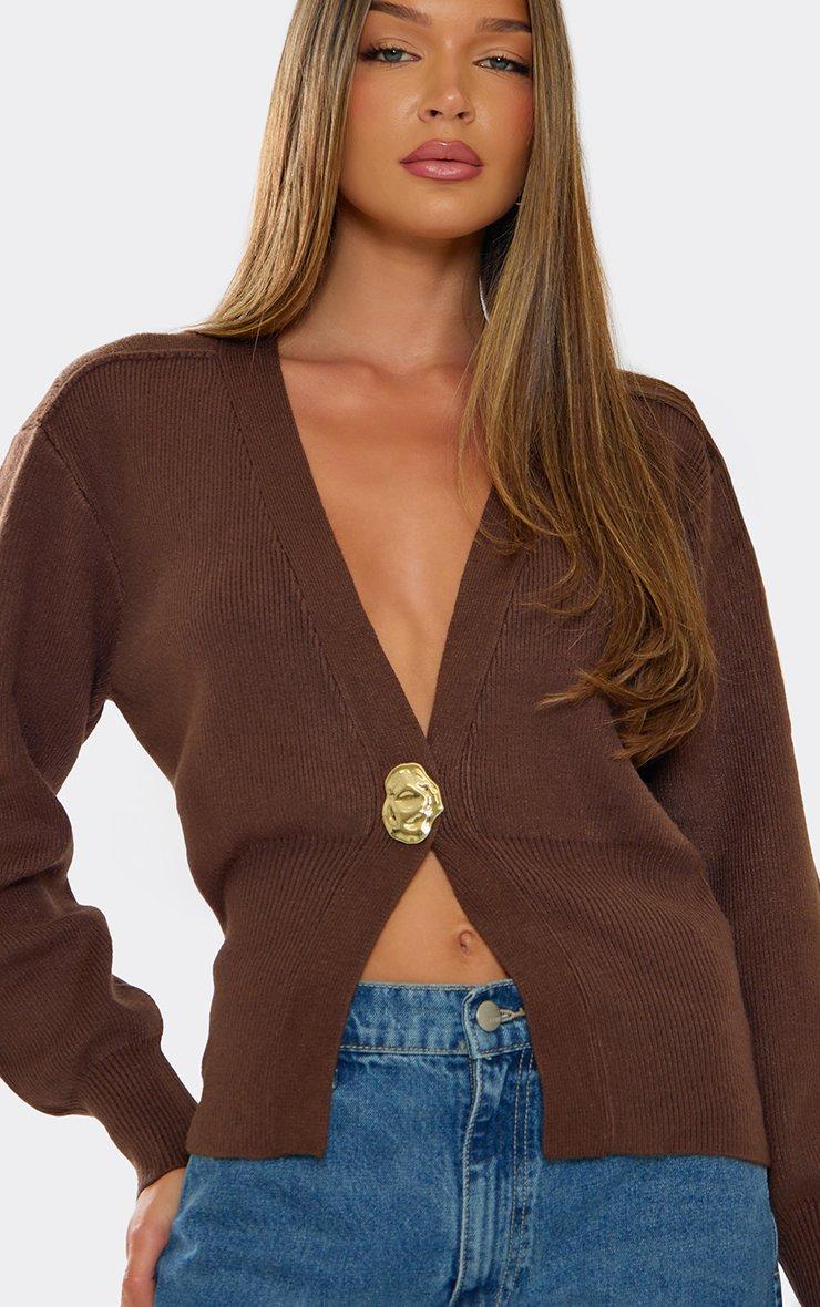 Long Sleeve Gold Button Detail Cardigan In Chocolate Brown Knit