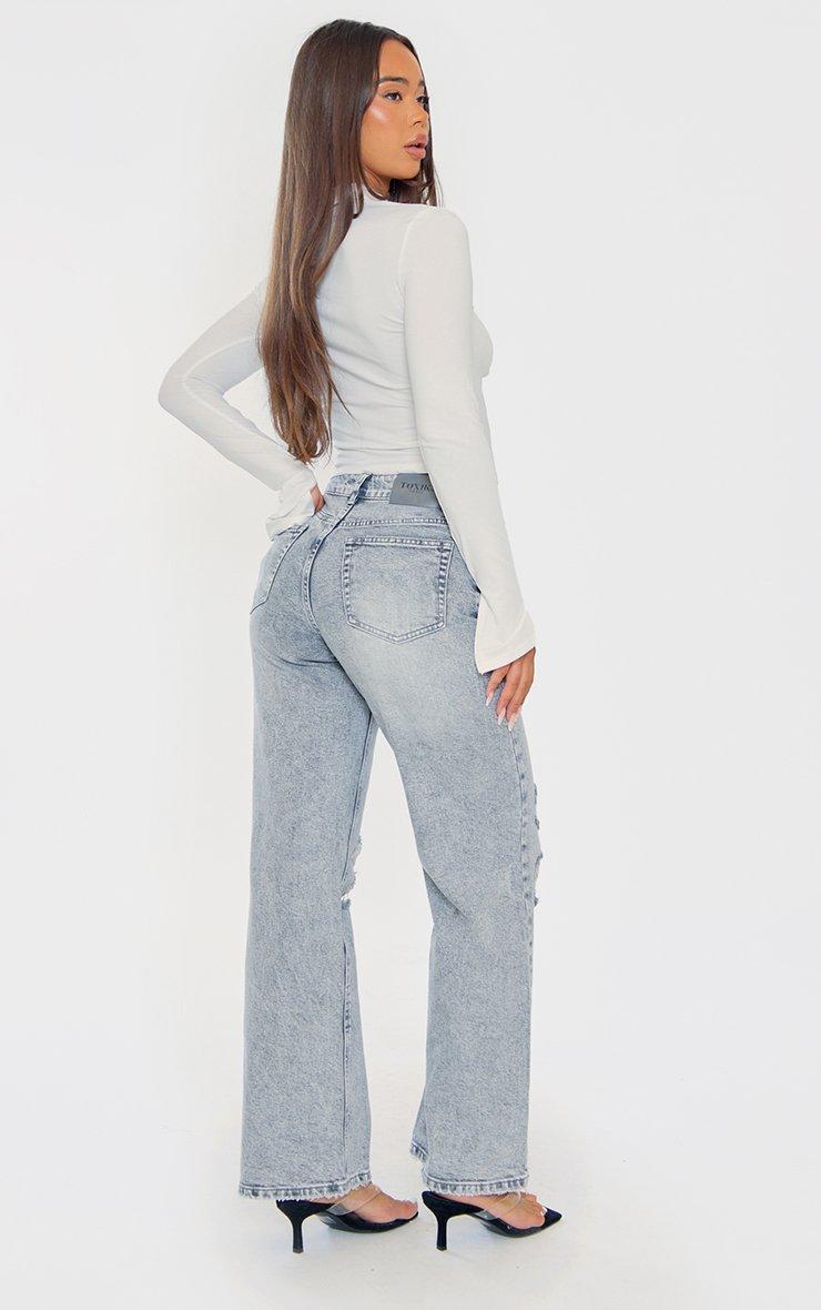 Low Rise Distressed Pattern Detail Wide Leg Jeans In Blue Denim