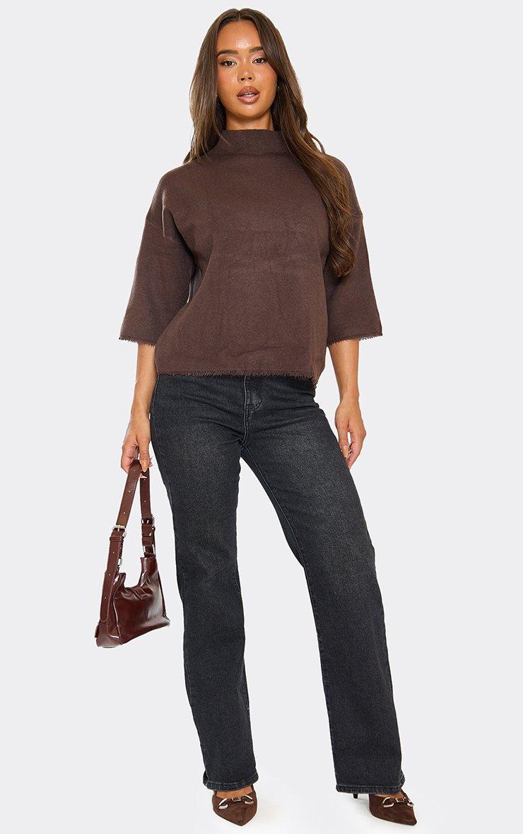 high neck batwing frayed hem detail top in chocolate brown compact knit