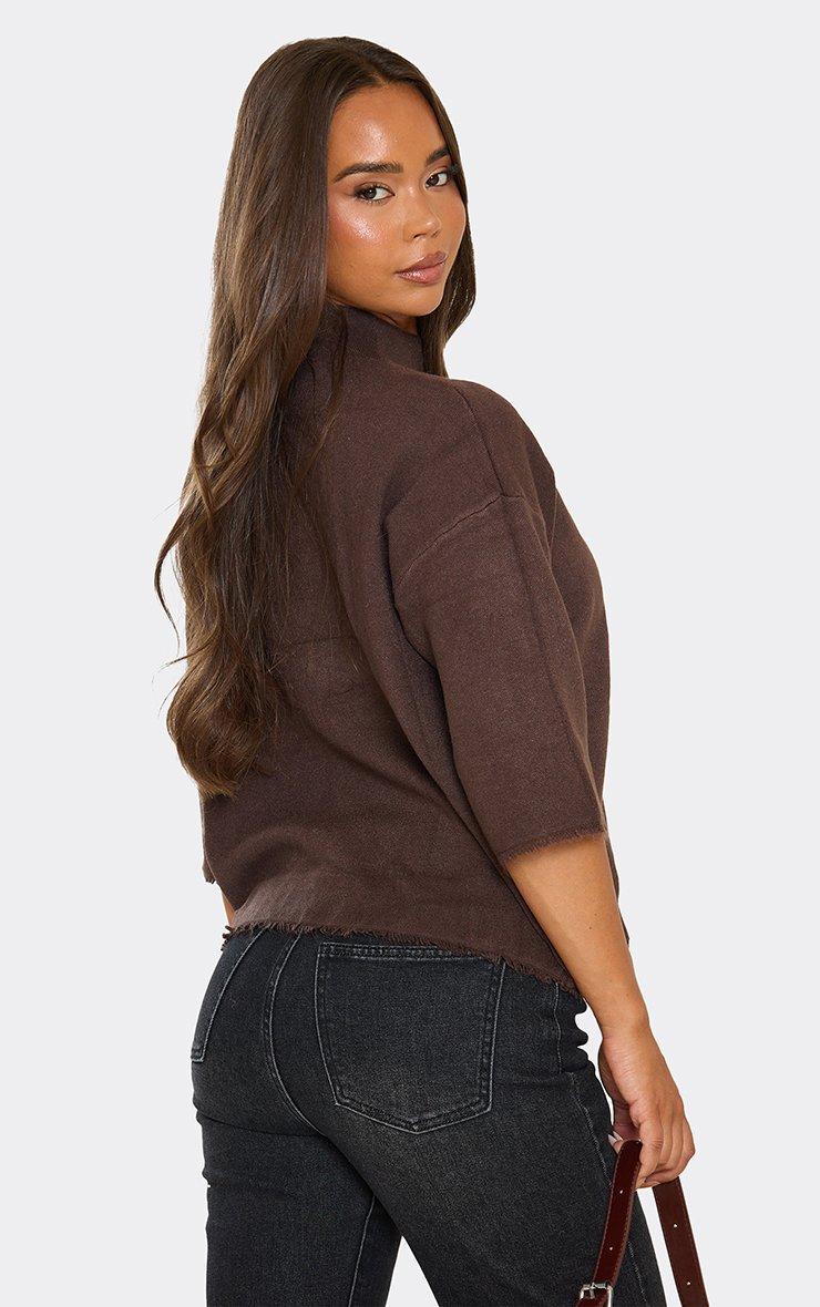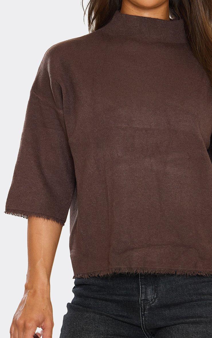 High Neck Batwing Frayed Hem Detail Top In Chocolate Brown Compact Knit