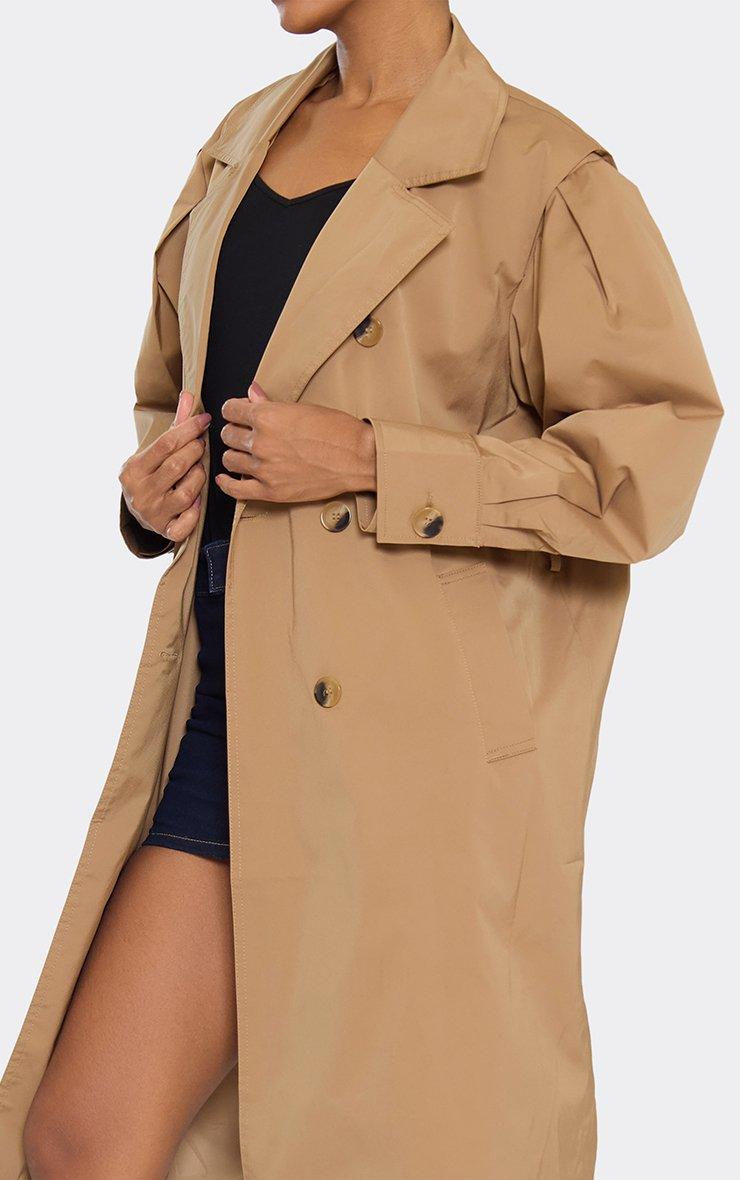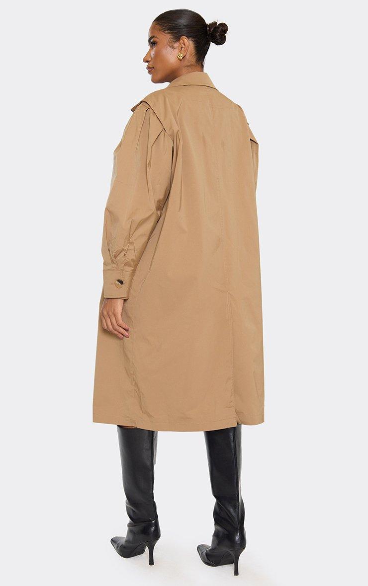 Long Sleeve Funnel Neck Trench Jacket In Chocolate Brown Faux Leather