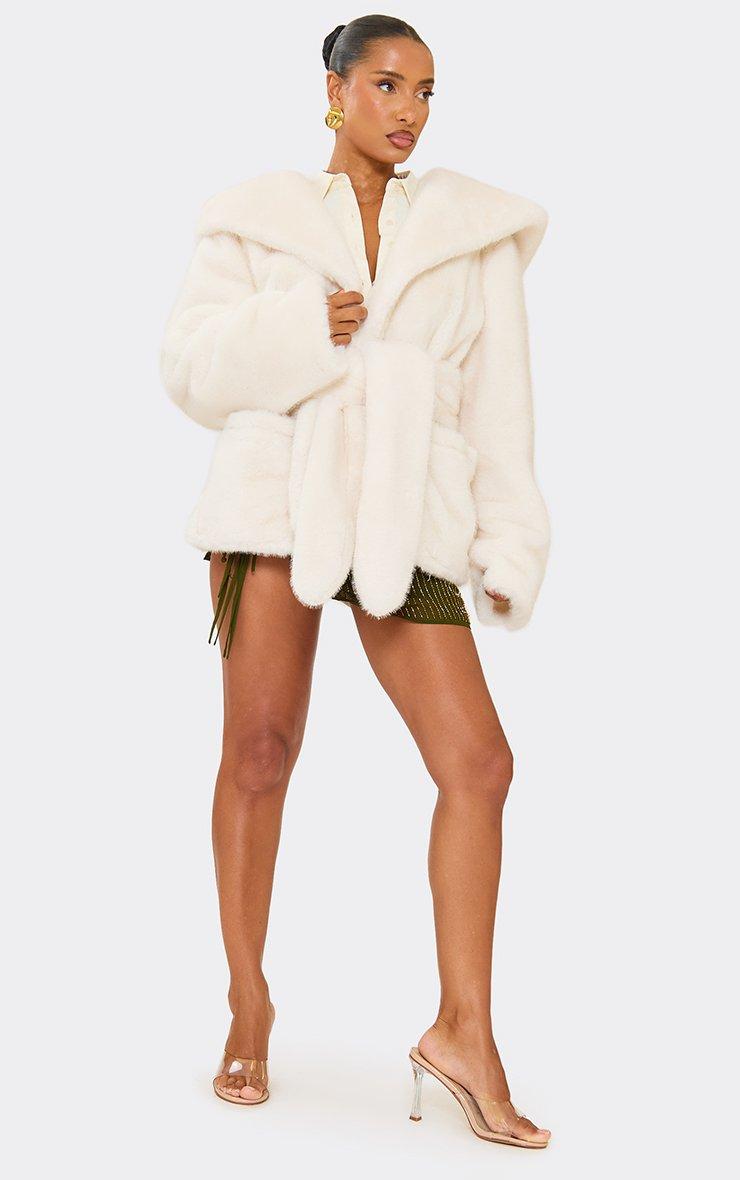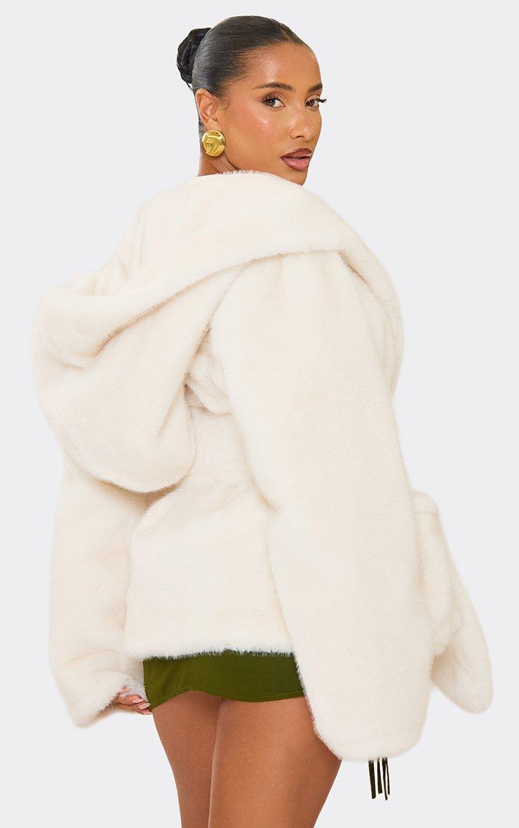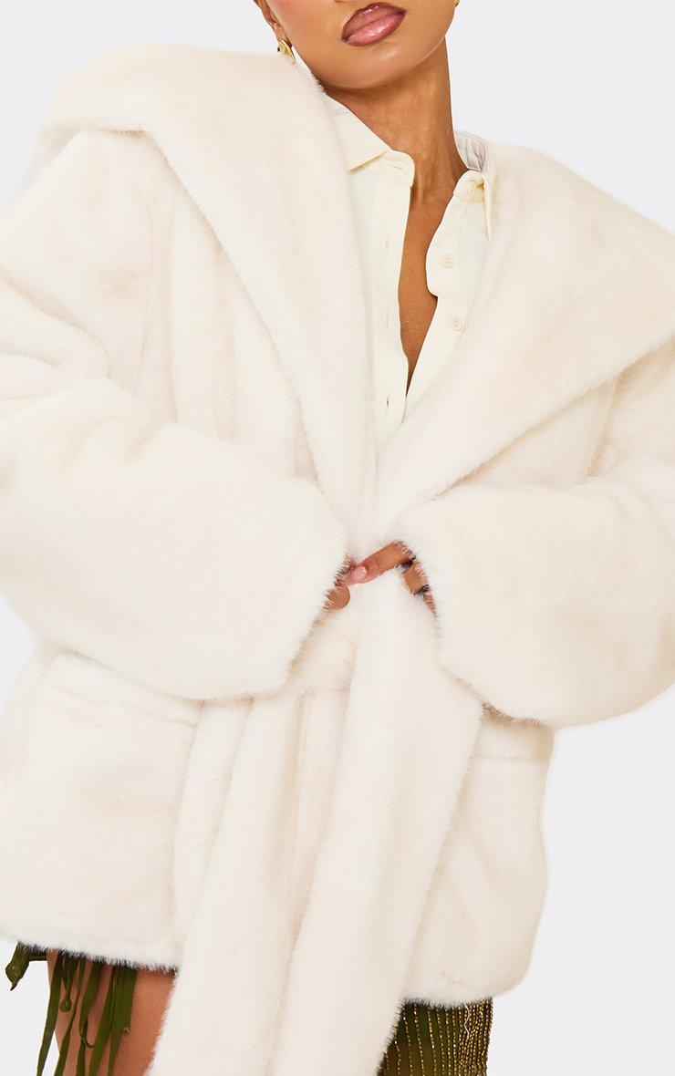 Oversized Hooded Tie Belted Waist Coat In Cream Fur