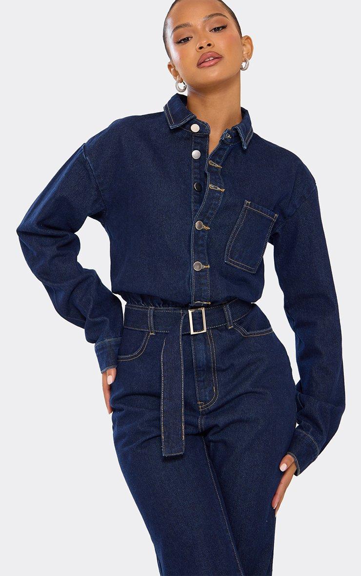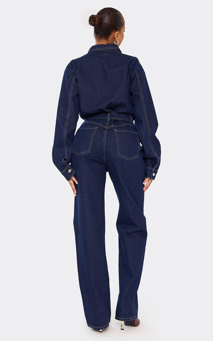 Long Sleeve Collared Button Down Detail Jumpsuit In Indigo Blue Denim