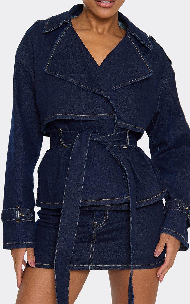 long sleeve belted detail trench jacket in indigo blue denim