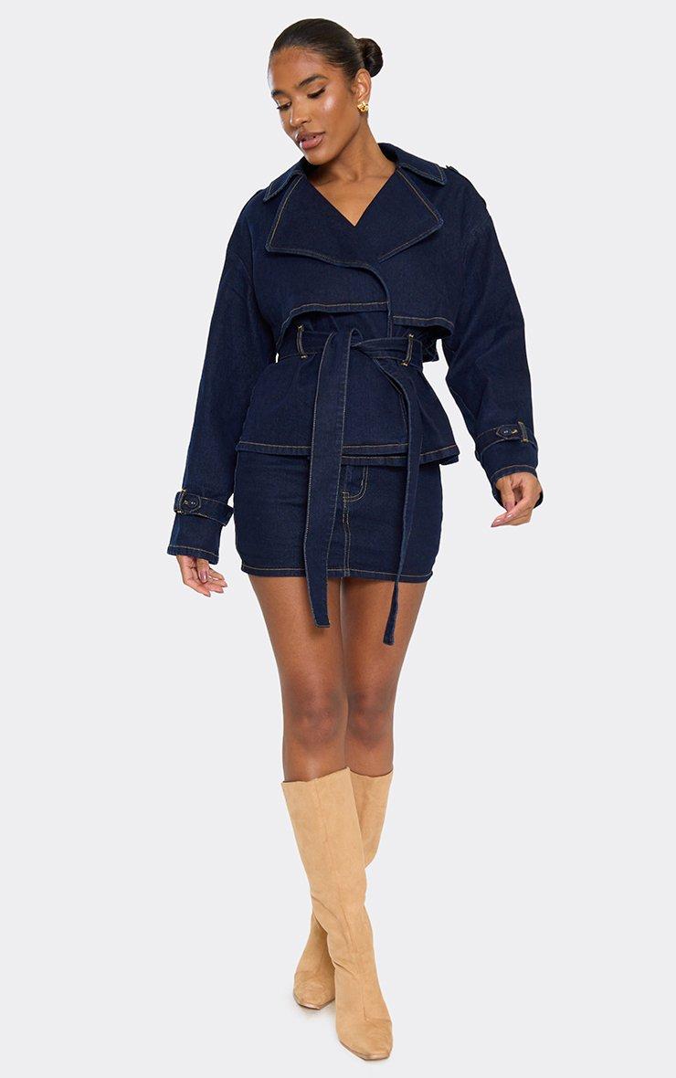 Long Sleeve Belted Detail Trench Jacket In Indigo Blue Denim