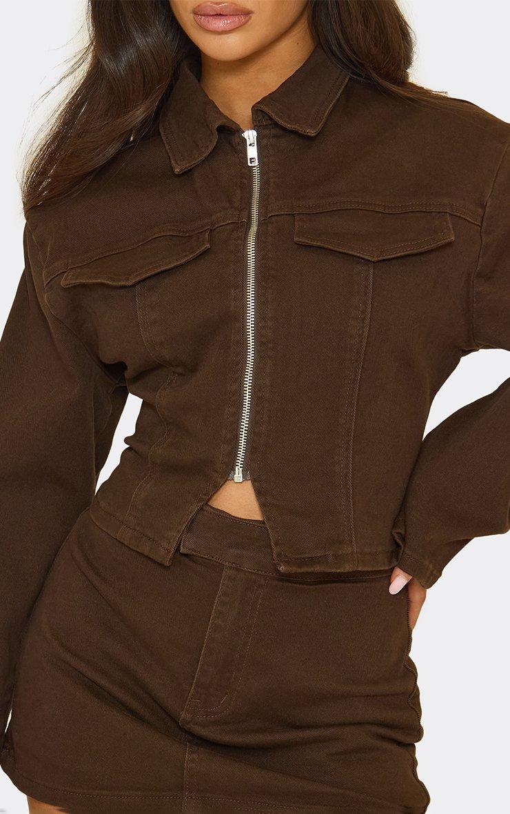 long sleeve zip up front cinched waist fitted top in brown denim