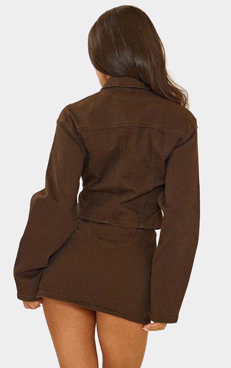 Long Sleeve Zip Up Front Cinched Waist Fitted Top In Brown Denim
