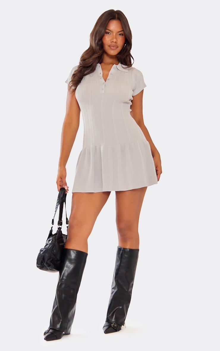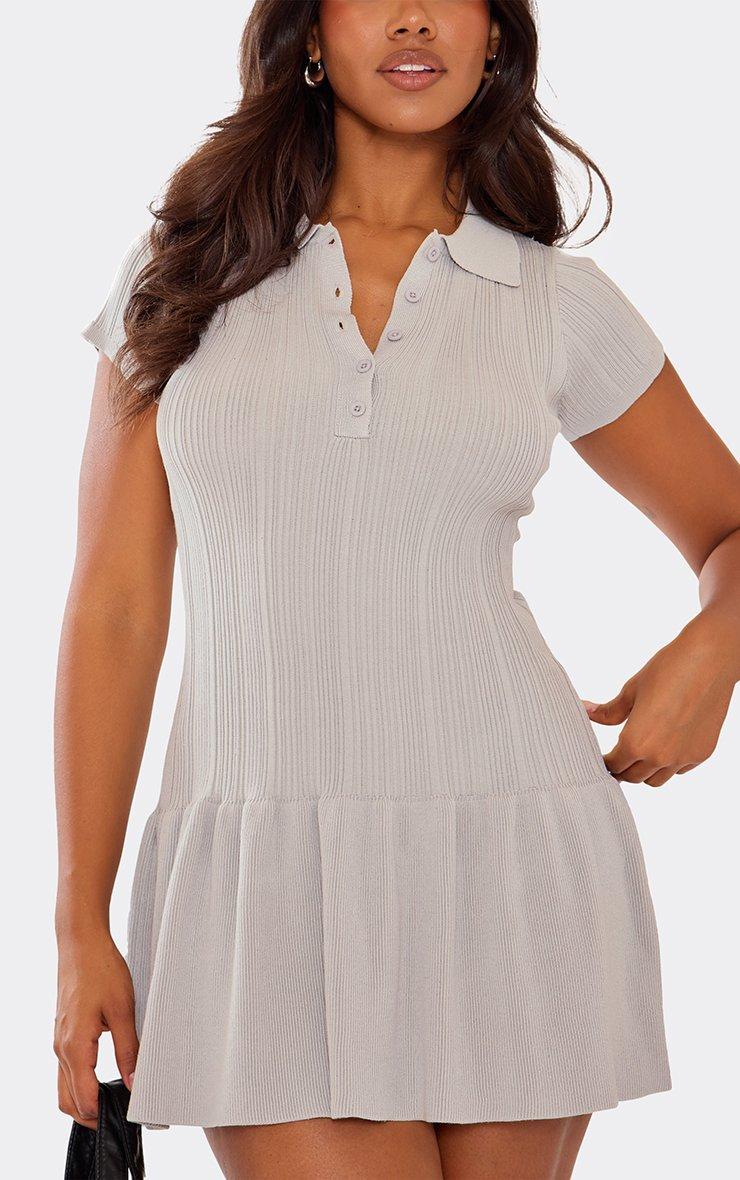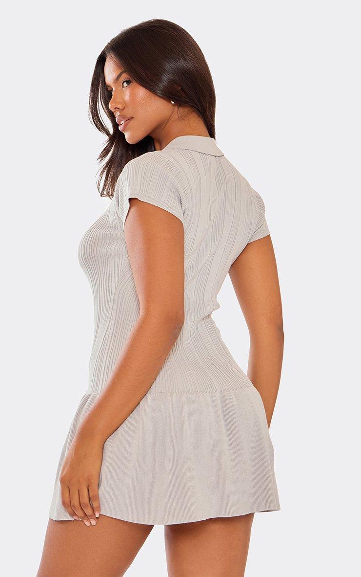 Short Sleeve Collar Peplum Detail Mini Dress In Grey Ribbed Knit