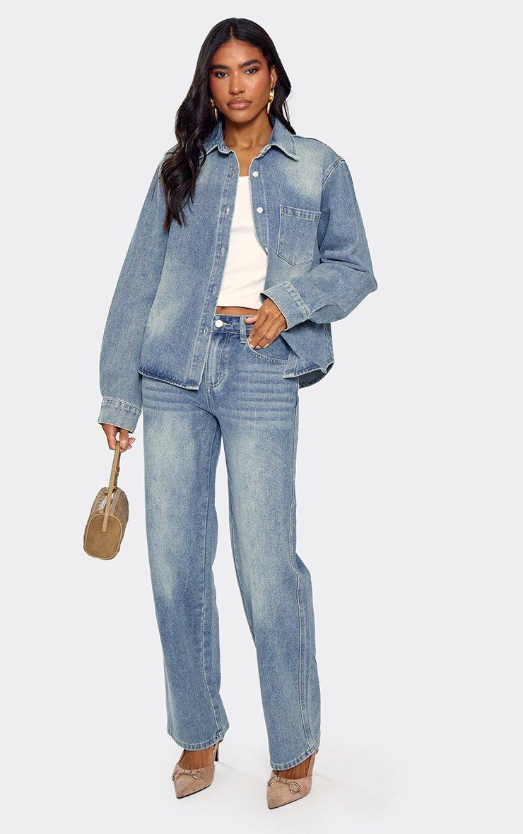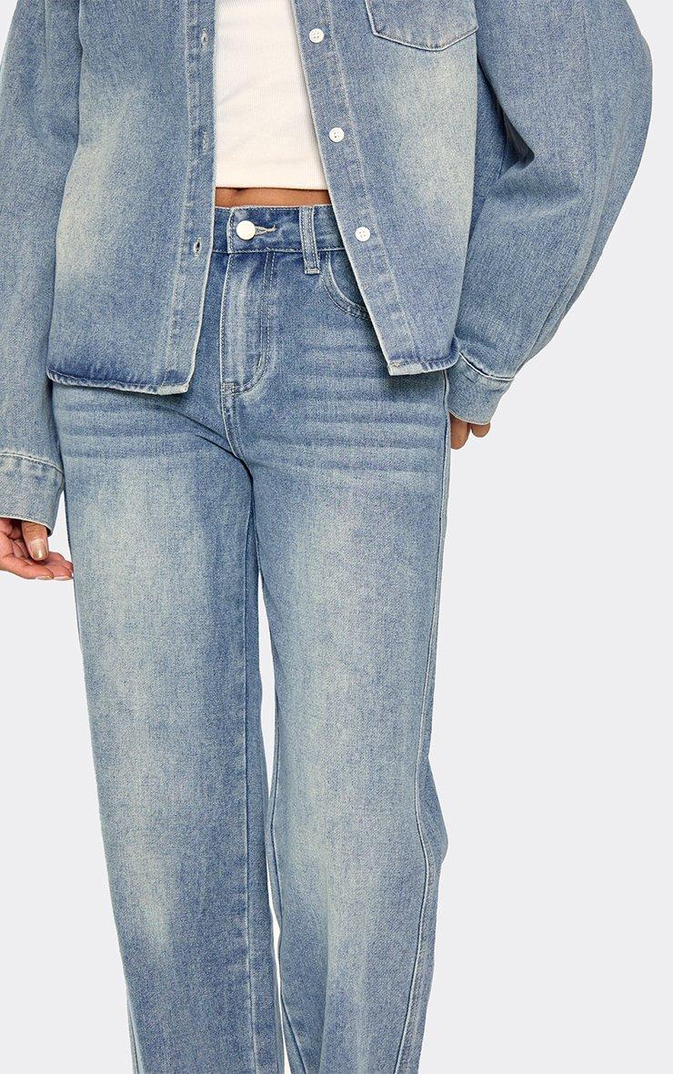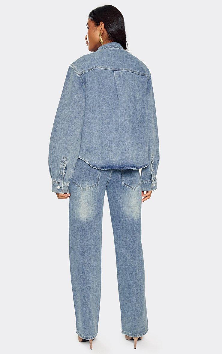 Mid Rise Straight Leg Detail Jeans In Washed Blue Denim