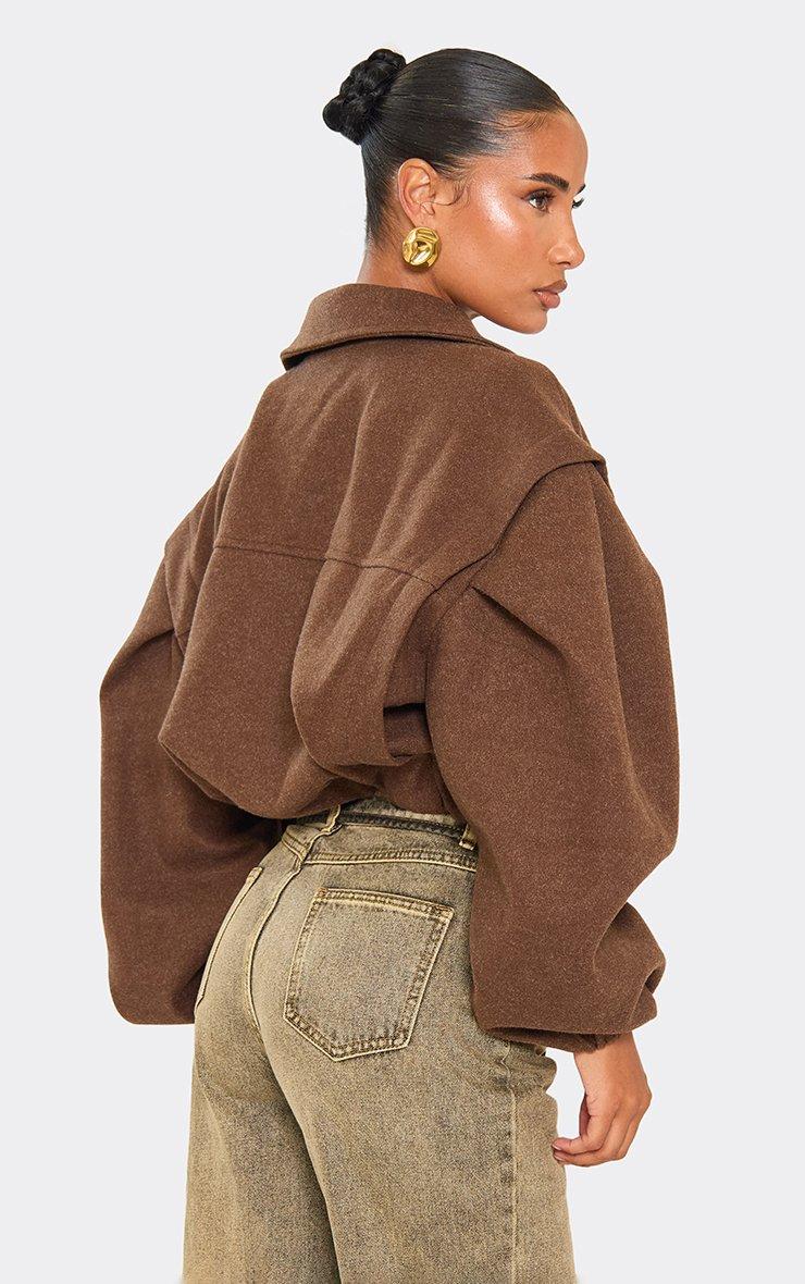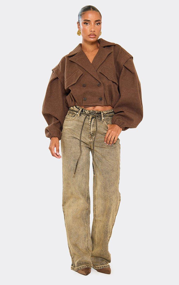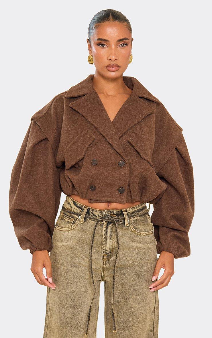 Long Sleeve Cinched Waist Cropped Wool Look Trench Jacket In Chocolate Brown