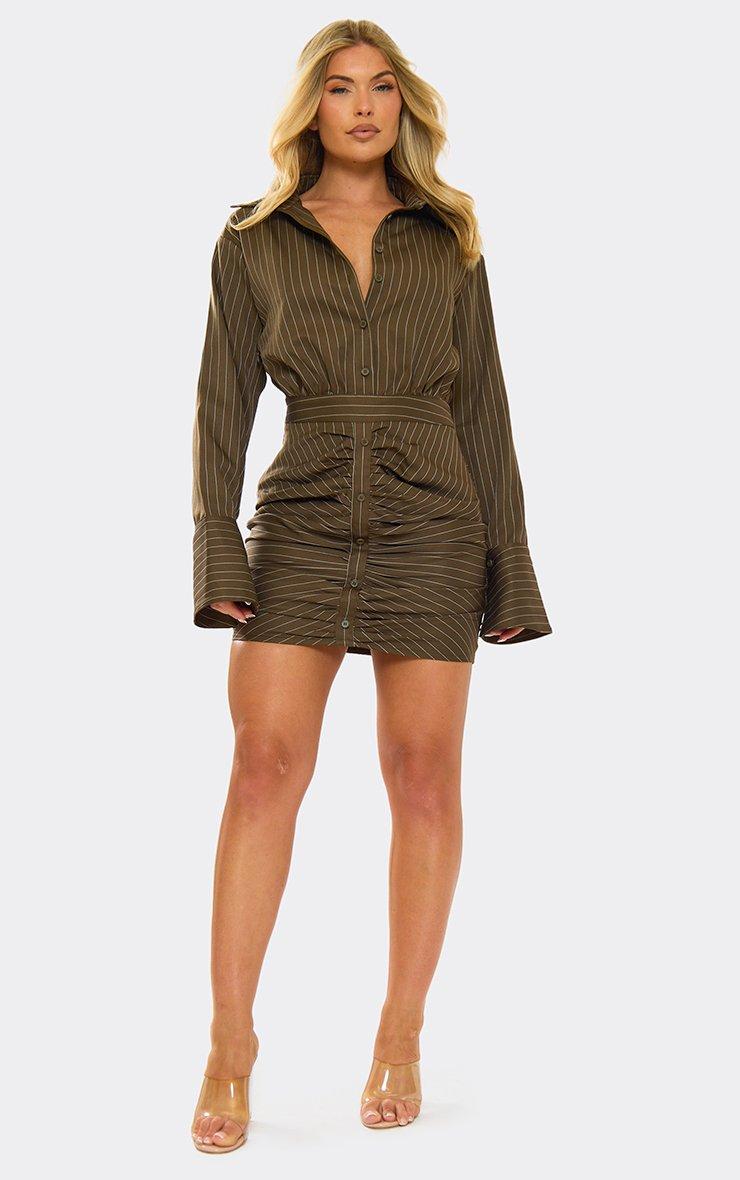 Long Sleeve Ruched Detail Shirt Dress In Dark Green