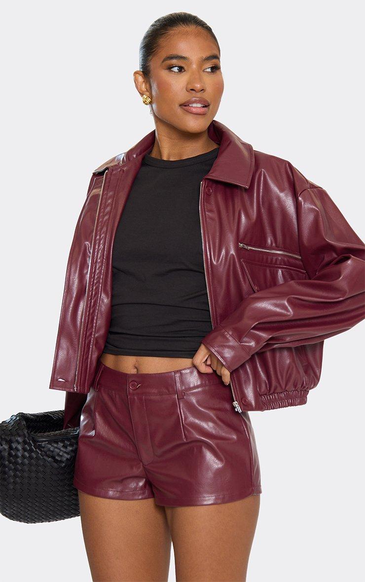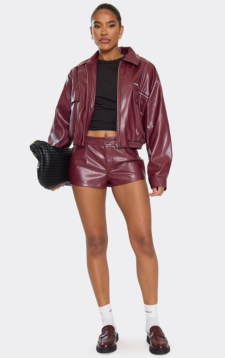 Mid Rise Hot Pants In Burgundy Faux Leather